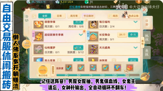 大话手游自由交易服休闲搬砖!懒人佛系多开躺赚怎么玩?直接焊死这套阵容:男魔+女魔+男鬼+女鬼+女神。 除了男鬼负敏,其他都是敏属性,懒人能挂机绝不手动专属顶配,啥任务都只干普通难度,主打一个不费脑。 挂机到塔四,心魔只到7层,有珠贝的任务别落下就行,帮派师门任务,五环打完,混满150活跃度直接下线,周末才稍微勤快一点。 本想着佛系挂机顶多混口汤喝,没想到每天稳定6档,搬砖收益一点都没有落下,以前天天肝满任务,现在才发现懒人多开才是搬砖天花板啊! 记住这个阵容,男魔女魔抽,男鬼保血线,女鬼主遗忘,女神补输出,全自动循环不翻车美滋滋,自由交易服的兄弟们放心冲~ [编辑:ssc]