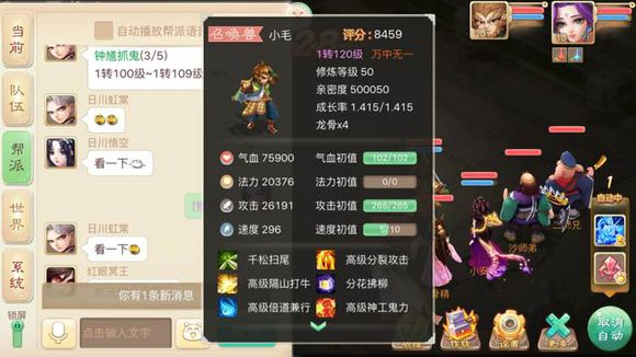 【本心得原创于叶子猪论坛,作者:三围吓死你,转载请注明来源】 最近维护内容新添加了召唤兽猴子,作为平民血攻宠,吸引了不少玩家的注意,对比热门召唤兽-迦楼罗王,还是很多玩家选择入手猴精,而且大话手游全服第一只万中无一的猴子终于被某玩家洗出来了,究竟怎么样呢?一起来看看吧! 召唤兽:猴精 1转120级 万中无一 修炼等级:50 亲密度:500050 成长率:1.415/1.415 龙骨 *4 猴精属性初值: 气血初值:102/102 法力初值:0 攻击初值:266/266 速度初值:5/10 携带技能:千松扫尾+高级分裂攻击+高级隔山打牛+分花拂柳+高级倍道兼行+高级神工鬼力 总的来说,这样的一只猴子还是相当不错的了,但是相对于神兽来说还是有一段距离的,却是平民玩家追求血攻宠的不二选择了。当然想要洗一只类似这样的万众无一极品召唤兽,不仅要看脸而且还得经济上的支持,笔者建议大家还是量力而行!且玩且珍惜! ▌关于游戏: 大话西游同名手游在玩法上继承了端游的经典玩法。诸如婚姻、家园、庭院、结义、PK、帮战、联赛、皇宫、五环、杀星、挖宝、做天、修罗、地宫、杀塔等大话2玩家所熟知的要素都将在针对智能手机特性优化后加入。而最受大话2玩家喜爱的情义社交体系,如帮派、结义、师徒婚姻系统等也将移植到手游版上。 2015,大话西游同名手游,话回青春,不见不散。 2015,大话西游同名手游,让我们静待这一次的青春到来。 大话西游手游官网:http://xy2.yzz.cn/sy/ 大话西游手游下载:http://www.yzz.cn/ku/dhxy/ 【叶子猪手游通大话手游QQ交流群】 叶子猪为广大玩家提供最活跃的QQ交流社区,在这里你可以畅所欲言,交流心得体会等,Q群更是会不定期内举办活动,越活跃得奖励的机会越大哦。 群号:213794076 [编辑:Dickson]