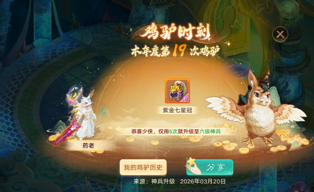2、6次就升级6级神兵了,真好运