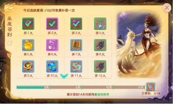 2)累计签到14次可获取套装洗炼符,助你洗练一臂之力!