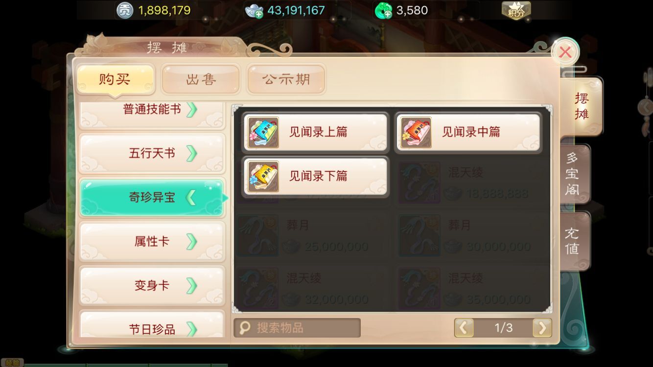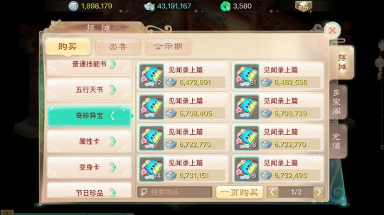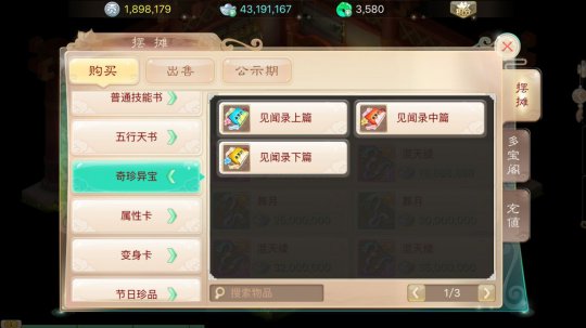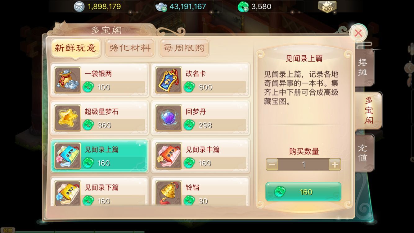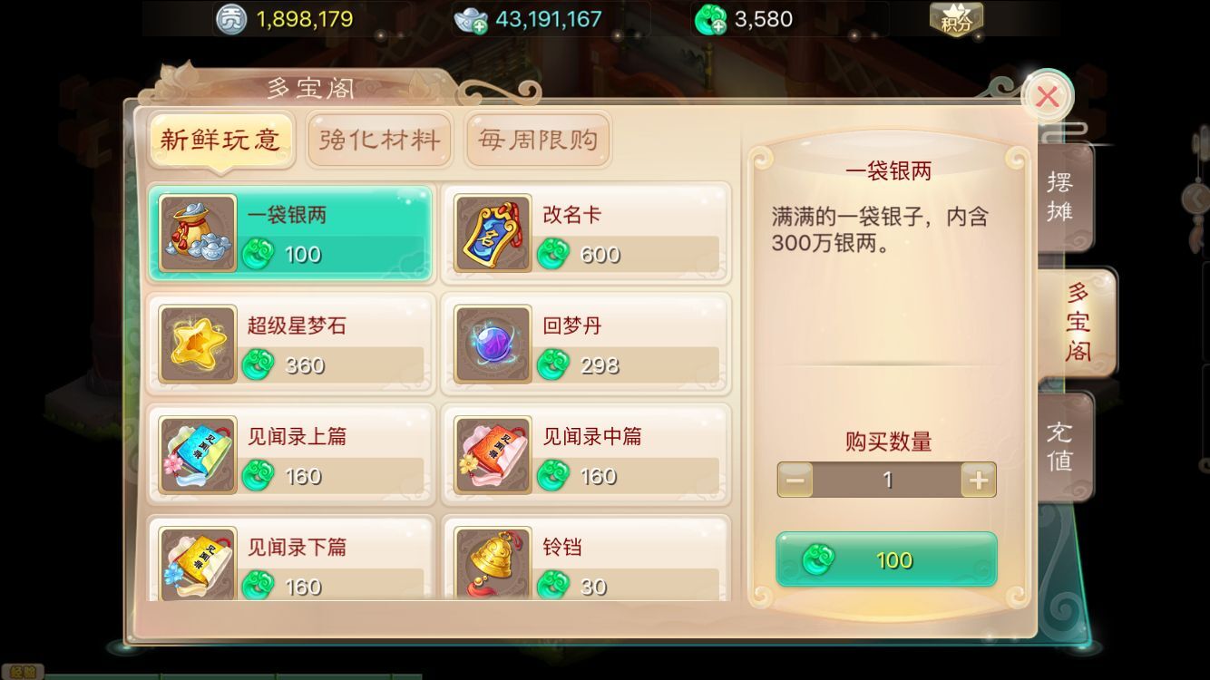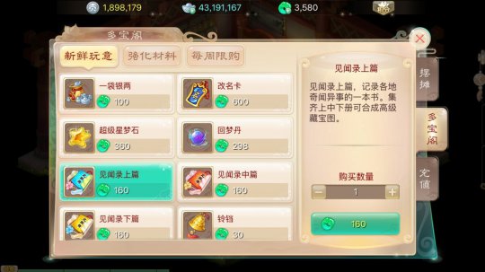 在“新鲜玩意”里的一袋银两需100仙玉兑换300万银两,对比一周限购实在是亏。然后朋友提点我可以考虑入手见闻录。