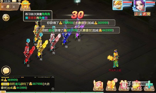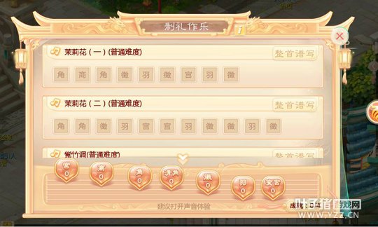 玩家完成三人以上组队,并于野外击杀乐使,即可获得相应音符。收集、并将音符拖动至乐谱中正确位置,即可完成一份完整的曲目。待“制礼作乐”成就达成,在美妙的古乐声中, 你还将获得 “清角”、“变宫”这样的特殊音符以及额外的经验奖励! 声动三界 在“八音迭奏”中弹奏动人乐章当你完成了三首不同曲子的制作后,还可前往教坊使处学习古乐器的演奏,开启“八音迭奏”的趣味玩法。在该玩法中,玩家需根据指挥,依次敲打音符,全部敲对后即可通过该回合的考验。