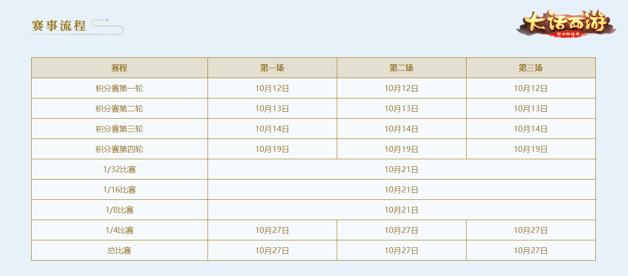 分组角逐公平竞技!第二届分级联赛一触即发 作为《大话西游》手游里一个展现自我身手的绝佳舞台,第二届“剑会群雄”分级联赛自报名开启以来,就得到了各路侠士们的积极参与与踊跃报名。相信每一位报名的侠士都能够在这个赛事中凭借自己的实力战胜对手,站上属于自己的江湖风云之巅! 在本届“剑会群雄”分级联赛中,赛程将分为积分赛、淘汰赛与总决赛三轮。积分赛将于今日晚上20时正式开始,并将继续在10月13日、10月14日及10月19日的20时持续进行,本阶段共将进行12场积分赛。在积分赛结束之后,排名前32的队伍获得晋级出现的资格,进入后续更加激烈的赛事角逐。 赛程一览