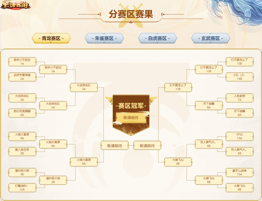 △青龙赛区:大伯突击队(超越梦想)、打不赢怎么了(飞珠溅玉)、火烧大草原(绝代双骄)、大乘飞仙(一叶知秋) *括号内为服务器名