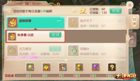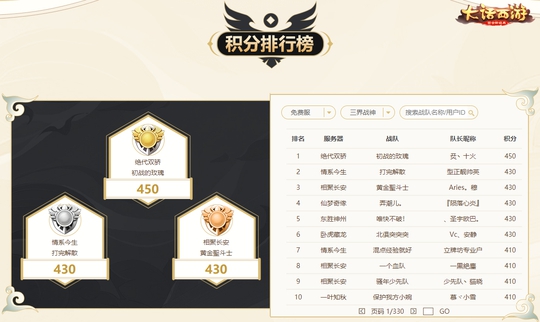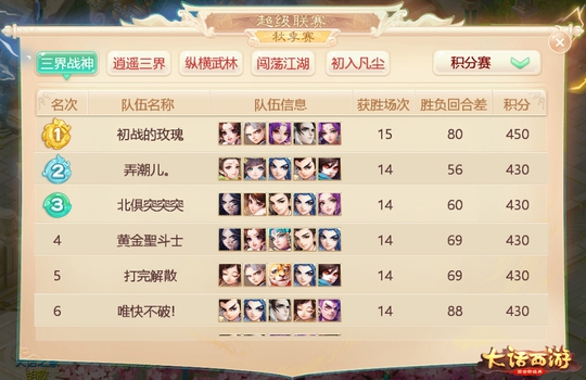 游戏内排名查询方式如下:玩家登陆大话手游进入日常活动页面,点击“秋季赛 比武”前往长安城脚下超级联赛接引人李嗣业(122,72)处,点击NPC与他对话,选择“赛况查询”,即可查看积分赛排名。