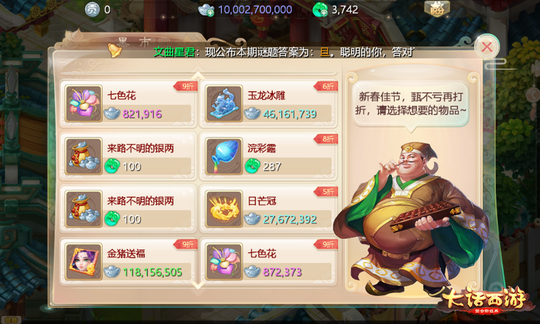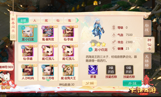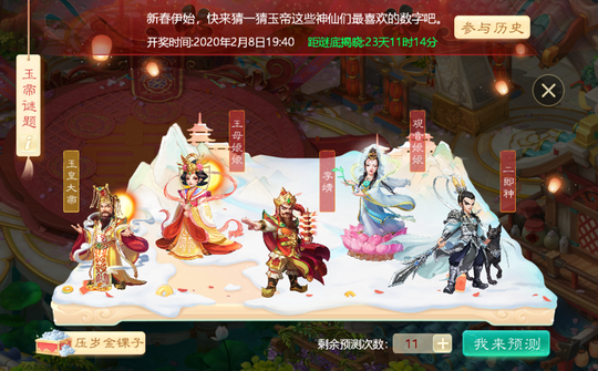 多重玩法齐上新 群仙贺岁乐不停在1月16日-2月9日春节活动进行期间,天上的玉帝、众仙、财神爷都将降临三界,为玩家们带来各种趣味十足的节日玩法,同时送出海量的经验和奖励!“玉帝谜题”、“财神许愿”、“群仙贺岁”、“星君下凡”、“驱赶年兽”、“踏春出游”、“庆典烟花”、“新春游龙”、“幸运吉符”、“吉鼠闹春”等全新活动玩法陆续登场,等待大家前往游戏里体验! 1月16日-2月8日19:00之前玩家可以参与“玉帝谜题”活动,竞猜神仙们喜欢的数字。在2月8日19:40,玉帝将会揭晓谜底,猜中神仙喜欢的数字的玩家,将按各个奖项瓜分玉帝为大家准备的新年压岁钱!