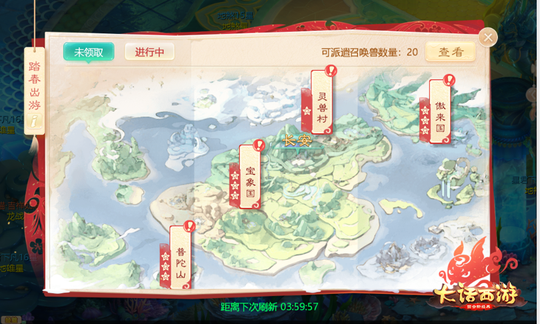 △ 驱赶年兽 少侠回乡过年,也不要忘了带召唤兽们出门玩耍一番,感受新春佳节的热闹气息。1月16日-1月30日参与“踏青出游”活动,玩家可以派遣召唤兽前往不同地点完成任务,获得各种惊喜奖励哦。