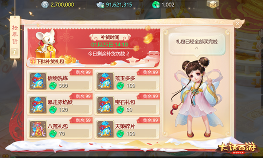 《大话西游》手游还为各位侠士们备好了特色年货,回馈大家一年来的支持,1月25日-1月30日期间,等级达到35级的玩家都有可能被新春福星选中,可以购买超值年货!全新鼠年家具将在年货中限量出售,千万不要错过添置宝贝的时机!