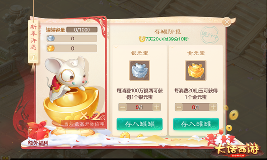 除了玉帝之外,财神爷也给三界侠士们送来意想不到的惊喜。玩家参与“新年许愿”活动,在除夕前向财神的罐中存入金银元宝,在春节后即有机会收获多倍福利!