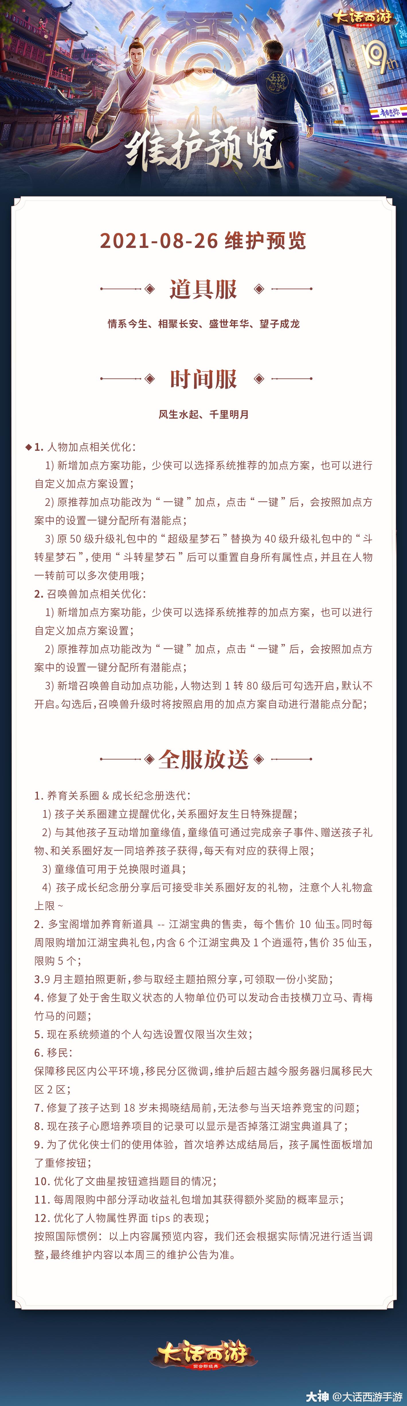 ☆8月26日的维护预览来了☆ ※局测服放送※ 1.人物、召唤兽加点优化,加点功能更加智能; ※全服放送※ 1.养育关系圈&成长纪念册迭代: 1)孩子关系圈建立提醒优化,关系圈好友生日特殊提醒; 2)与其他孩子互动增加童缘值,童缘值可通过完成亲子事件、赠送孩子礼物、和关系圈好友一同培养孩子获得,每天有对应的获得上限; 3)童缘值可用于兑换限时道具; 4)孩子成长纪念册分享后可接受非关系圈好友的礼物,注意个人礼物盒上限~ 2.多宝阁增加养育新道具--江湖宝典的售卖,每个售价10仙玉。同时每周限购增加江湖宝典礼包,内含6个江湖宝典及1个逍遥符,售价35仙玉,限购5个; 3.移民: 为保障移民区内公平环境,移民分区微调,维护后超古越今服务器归属移民大区2区。 详情请看图: