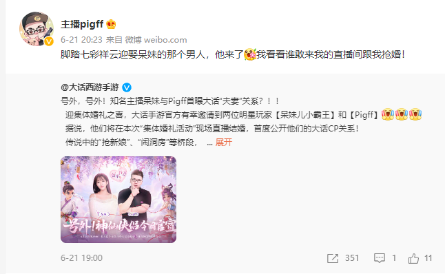 六月的室外阴雨连绵六月的大话游戏却在如火如荼地“搞对象”就在上周6.23第二场“千里茵缘一线牵”活动 呆妹和pigff共同亮相婚礼现场首爆他们的大话玩家身份以及“情侣”身份(大概吧,当天结完就说要离)让我们来回顾下这究竟是一场什么样的“闹剧”吧! 事件回顾一高调官宣!婚礼前三天共同发文在623婚礼正式举办前呆妹和pigff就双双在自己的微博上官宣了彼此“准备结婚”的消息言辞十分高调放飞男方表示要脚踏七彩祥云娶呆妹女方表示要让自己的粉丝去给她随份子钱 一个比一个不顾粉丝感受!当然,狗粮撒得兇,都是要还的… 事件回顾二直播证明:爱情路途艰难 且行且珍惜 到了6.23婚礼活动当天双方如约上线大话新服【盖世英雄】新郎Pigff因为等不及提前十分钟上线而呆妹则为了“第一次结婚”特意于当天在衣着上打扮了一番 看得pigff和直播间的观众春心荡漾可惜好景不长Pigff再次证明了直男体质死得快婚礼流程开始后呆妹凭凭用她的“夹子”音对pigff传递爱意不仅明示“第一次”给了你 还并称呼对方为夫君而铁直男不仅全程都专注在游戏上(甲方点赞)还在呆妹称呼夫君的时候回应了一句“yue”在这个转折之后双方打开了互损式婚姻殿堂 把屏幕前的观众乐得群刷弹幕“叫好”不过,双方秉承了爱的初衷(甲方疑惑)还是一起走完了撒喜糖、拜堂和洞房等结婚流程…还在婚礼现场给粉丝几度发福利 事件回顾三结完就离?搞笑触发游戏设定在“艰难”地走完婚礼流程并拿到结婚证书之后 呆妹和pigff还没停止互损双方也因此表示“日子过不下去”当场就要离婚然而,当双方找到离婚按钮并触发时却被系统提示三天内无法离婚大话最大牌“三日夫妻”由此而生! 简单的几个回顾可能道不尽直播间的故事和精彩大家可以在6月29日19:13:14前往最后一场婚礼现场亲自体验呆妹和pigff这对欢喜冤家的结婚旅程 对了,除了婚礼活动本次版本还有大家反响热烈的七彩祥云特效七彩祥云特效由大话手游和大话同名电影联名定制 仅在6月30日前通过活动上架发放喜欢大话电影和这款特效的少侠请尽快前往获取~ [编辑:叶子猪小秘书]