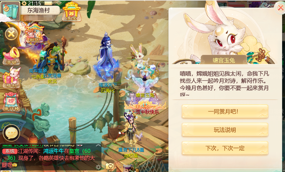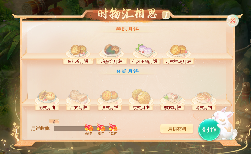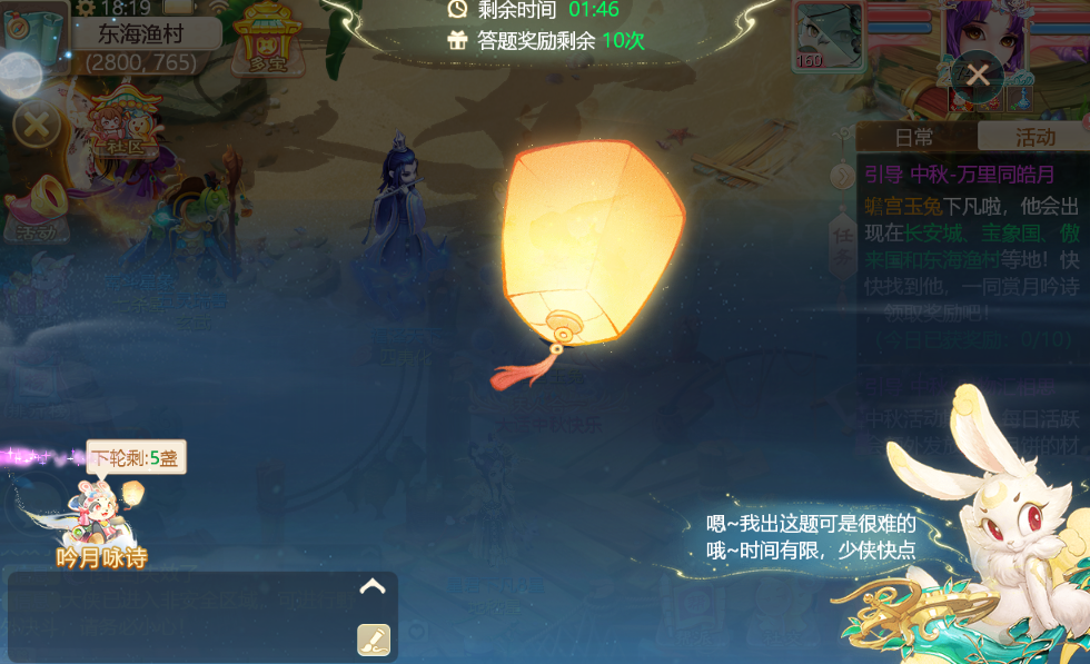 玉兔追月,雅聚中秋。 蟾宫玉兔又下凡来给大家送礼啦! 参与活动玩法可获得“明月提灯”实物月饼礼盒、中秋节主题特效、高级藏宝图、见闻录、五行材料、聚魄丹等珍稀道具奖励!赶快来看看活动内容吧! 点击文末阅读原文前往活动专题 2022中秋节活动活动时间:2022年9月10日上午5:00——2022年9月13日上午5:00 活动一:万里同皓月 活动时间:2022年9月10日5:00—2022年9月13日5:00参与条件:0转80级以上,单人参与活动简介:玉兔追月,雅聚中秋。中秋佳节来临,蟾宫玉兔又来下凡给大家送礼啦!活动期间,每逢15分与45分中秋使者蟾宫玉兔就会降临长安城、宝象国、傲来国和东海渔村为大家出题对诗,各位少侠一定要抓住机会和玉兔吟月对诗,赢取奖励! 活动奖励:2级五行材料、1级五行材料、聚魄丹、浣彩露、见闻录、终极技能书残卷、特殊元气丹、高级藏宝图、珍稀神兽属性卡 活动二:时物汇相思 活动时间:2022年9月10日5:00—2022年9月13日5:00参与条件:0转80级以上活动简介:中秋佳节吃月饼,是中国源远流长的传统文化民俗!活动期间,每日活跃度达成一定目标会获得月饼材料礼包,打开礼包将随机获取用于制作中秋月饼的材料!快使用这些材料制作甜美可口的中秋月饼吧!各位少侠收集越多种类的月饼,可以解锁越丰富的奖励!若少侠材料有所不足,也可通过消耗郭氏积分兑换所需材料。小提示:和好友相互分享交换美味的月饼,可以更快解锁更多的月饼哦。 活动奖励:【明月提灯】中秋礼盒、中秋主题特效:兔爷擂鼓、2级五行材料、1级五行材料、聚魄丹、浣彩露、见闻录、终极技能书残卷、特殊元气丹、高级藏宝图、珍稀神兽属性卡 星君下凡 活动时间:2022年9月10日5:00—2022年9月13日5:00参与条件:0转35级以上活动简介:适逢中秋佳节,星君也被人间的美丽月色吸引,降临人间。活动期间,将会在原有地煞星的数量基础上,额外刷新一倍的地煞星!星君下凡活动中的地煞星与原本地煞星相同,共享每日5次的杀星进度。 本周更新维护后,与蟾宫玉兔一起对月吟诗吧! 更多官方活动,请关注叶子猪《大话西游手游》官方合作专区。 [编辑:叶子猪小秘书]