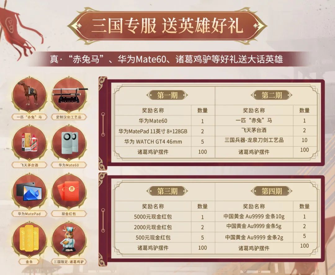 【维护公告】 为了保证广大玩家的游戏质量,《大话西游》手游版将于2023-11-02上午8:00停机,进行每周例行的维护工作,维护时间为早上8:00-10:00,如果在维护期间无法完成维护相关事宜,开机时间将继续顺延,请各位玩家相互转告,并留意游戏时间,以免造成不必要的损失。对于停机期间给您带来的不便,敬请见谅,网易游戏感谢所有玩家朋友的支持和配合! 【三国秘宝盛大开启】 随着貂蝉的到来,神秘宝藏已然浮现于世,11月2日维护后,三国秘宝活动盛大开启! 1)充值有礼活动期间达成充值目标即可获得祈愿次数,完成祈愿即可获得全新典藏队标“义三国”,永久称谓“三国风云定乾坤”; 2)隆中献策活动期间每日登陆即可免费领取礼包,每日还可使用银两购买限量超值礼包。每次打开礼包时均可积累妙策值,累计妙策值达到不同数量,即可免费领取含全新聊天气泡“英雄泡泡”在内的多种好礼! 3)神骏扬威神骏座驾赤兔现世,首款特别座驾支持双人贴贴,更有貂蝉伴你同游! ①使用神骏礼券即可参与神骏扬威活动,获取限时宝物逐风币与驭骑币; ②驭骑币可在座驾奖池不放回地抽取各种豪礼,包含双人座驾“赤兔”、翅膀“悬旌万里”、足迹“草船借箭”、自选珍兽盒子等奇珍好礼; ③通过本活动获取双人座驾“赤兔”时,将额外附赠貂蝉同乘功能,单人乘坐时可生效。貂蝉同乘功能无法随赤兔礼盒上架摆摊; ④逐风币可用于在兑换商城兑换多种好礼,海量奖励任您挑选; ⑤使用神骏礼券达到一定次数后,可领取包含限定头像框“乱世英雄”在内的多款好礼,更可获取全新座驾幻肤“的卢”!“的卢”不可上架交易。 ⑥座驾奖池所有奖励获取一次后,将更新为一批全新奖励,包含自选特殊元气丹。 更新奖励一次后将不再更新奖池。注:为保证美好的共乘体验,与朋友(或貂蝉)共乘赤兔(或的卢)时,将隐藏翅膀及随身特效。 4)龙乘时变全新召唤兽幻肤横空出世,更可使用银两参与抽奖! ①全新召唤兽幻肤“青龙·天星卧龙”、“念·念奴娇”、“龙兔·鱼升龙门”现已推出,在龙乘时变活动中使用星象图参与抽取即有机会获取,星象图可使用银两或仙玉在多宝阁或摆摊购买! ②抽取到的幻肤丹可转化为将星石,在兑换商店内兑换所需的指定幻肤,还可兑换召唤兽龙兔; ③青龙幻肤丹在活动中仅可抽取与兑换各1个,并在交易锁定期结束后,可上架摆摊。 5)风云特卖风云特卖将于11月6日开启,超值礼包即将上架! ①双十一限定福利!抢购阶段购买任意礼包均有机会掉落大话实物奖励!超多奖励等你来抢!奖励总量有限,先到先得。每人至多可获取3份实物奖励。 ②参与特卖可获得饭粒与秒杀积分,饭粒可用于抵扣购买礼包所需仙玉。秒杀积分可用于解锁秒杀礼包,获取全新随身特效“桃园结义”与空间主题“草船借箭”。 【群雄巅峰赛来袭】 巅峰赛即将开赛: 1)第一轮常规赛将于下周四(11月9日)正式开赛; 2)斗志积势活动将于本周开起,为赛事助威可以获取各类强化效果; 3)各类观赛活动将于下周一同步开启;属性卡切换观察到有部分种族(比如龙族)PK和日常有变不同类型卡的需求。为避免反复覆盖,本周维护后支持同时变2张卡,但同一时间只能生效1张,允许自由切换。(温馨提示:未生效的副卡时间不会冻结,过期将自动消失) 【三国庆典专服上线】 话三国,战群英!大话三国活动专属新服【英雄美人】已在2023年10月31日12:00盛大开启! 本次三国专属新服将开启以下活动: 1)桃园结义福利三国专服”发”实物与混沌福利:福利持续1个月,开发组准备了一批好礼献给三国专服玩家。活动期间,玩家完成活动要求的各项任务,即可获得三国礼袋,有机会获得一匹“赤兔”马、华为mate60手机、飞天茅台酒、华为平板、5000元现金红包、中国黄金Au9999金条、绝版混沌召唤兽龙兔、绝版混沌时装等惊喜奖励!本活动共分4期,每7天一个周期,每个周期都会有大量豪礼送出: 2)专属鸡驴彩蛋活动 三国专服发海量变色召唤兽:活动持续半个月,三国专属新服将开启专属鸡驴彩蛋活动。 ①每天都可以在野外拾取3个鸡驴蛋; ②拾取鸡驴蛋时,优先获得自己暂未点亮的普通/高级召唤兽图鉴的蛋; ③鸡驴蛋孵化需要等待20小时,最后2天仅需1小时,孵化完成后,可能获得对应的变色召唤兽/元气丹/变身卡等奖励! 3)首充必返现金三国专服“发”首充现金:在三国专服完成任意金额首充,必返3元-100元现金红包!(红包限量一万个,先到先得) 【其他优化更新内容】 1. 移民:道具服一飞冲天开启移民功能,归属玄武大区(仅道具服); 2. 金扫帚优化:非卡级服每日必做任务由3个改为2个,并额外增加便捷【前往】功能,优化了部分表现(说明:每日必做3改2本周五5:00后方才生效); 3. 优化了养育等级的提升指引; 4. 降低了新主线剧情第九回、第十回部分战斗的难度; 5. 独步天下本周对重复职业匹配和低段位等级跨度问题进行了优化,同时增强对定位选择的指引; 6. 帮派每日通过其成员完成帮派任务时获得的资材增加上限,具体上限为帮派等级最大容纳人数*20次; 7.月卡特权前瞻:开通了月卡特权的少侠,可根据需要选择花费仙玉升级24小时不离线特权,升级价格低至5仙玉/天。特权预计11月中旬上线,敬请期待! 以下内容在2017、大话西游、情系今生、相聚长安、风生水起服务器放出: 战斗系统优化: 1)新增敏序查看功能:可在PVE战斗中看到己方和怪物
