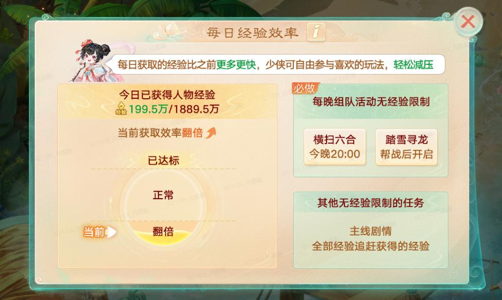 【维护预览】 端午寻味 龙舟竞渡解粽香,悬艾沐汤共端阳。端午节活动限时开启!唐王昭告天下,今年端午的粽子由他统一请客喽!不过,想要吃上这皇室的粽子,好像也没那么简单哟~ 龙舟竞渡解粽香,悬艾沐汤共端阳.端午节活动限时开启!唐王昭告天下,今年端午的粽子由他统一请客喽!不过,想要吃上这皇室的粽子,好像也没那么简单哟~ 参与等级:0转80级以上; 参与等级:0转80级以上; 开放时间:6月6日维护后-6月13日5:00; 开放时间:6月6日维护后-6月13日5:00; 1)皇家秘粽:唐王委托东海龙王和观音姐姐分别收集粽子的材料和馅料,少侠们完成他们二人的委托后,就可以获得粽子材料和馅料,并上交到皇宫的粽子制作台处换取奖励啦!服务器内的所有少侠们上交的材料越多,粽子就会变得越来越大!粽子的制作每完成一个阶段,每晚19点,皇宫内就会撒下大量“皇家小粽”,拾取后还有机会获得本年度限定的大话西游端午冰粽礼盒; 1)皇家秘粽:唐王委托东海龙王和观音姐姐分别收集粽子的材料和馅料,少侠们完成他们二人的委托后,就可以获得粽子材料和馅料,并上交到皇宫的粽子制作台处换取奖励啦!服务器内的所有少侠们上交的材料越多,粽子就会变得越来越大!粽子的制作每完成一个阶段,每晚19点,皇宫内就会撒下大量“皇家小粽”,拾取后还有机会获得本年度限定的大话西游端午冰粽礼盒; 2)赛龙舟:东海龙王今年又举办了一年一度的龙舟大赛,不参加他的比赛,可是没那么容易得到皇家秘粽的材料的~和好友组队,依次战胜龙王设下的考验,化身东海中最亮眼的仔; 3)幻境除妖:观音姐姐正忙于应付前来捣乱的五毒妖物,不堪其扰。她放出话来,能够帮忙驱除五毒妖物的少侠,才能获得她收集的皇家秘粽馅料~单人进入幻境,驱使元神和幻境之中的妖物进行战斗,获得它们的元神,就可以在观音姐姐处兑换皇家秘粽馅料等丰厚奖励。越深入幻境,奖励越棒哟; 4)端午祈福:端午节快到了,去小伙伴们的家园里,为他们挂上一枚驱邪祈福的香囊吧。参与玩法还能获得幻境助力宝箱,助力少侠幻境除妖哦; 5)星君下凡将于活动期间开启,”吾等地煞星君,特在端午佳节下凡游历,大侠前来可是想与吾等一试身手?“; 6)节日减负:端午节活动开启期间,将不生成每日必做任务,通关赛龙舟玩法将额外获得一个金扫帚;同时,本周周末活动将暂停开放; 巅峰赛S7 巅峰之战,愈战愈勇!六支晋级队伍脱颖而出,即将出征线下决战! 1)巅峰赛常规赛阶段已经全部完成,积分前六队伍现已出炉;2)齐聚巅峰活动将于本周四(6月6日)维护后开启,集换晋级线下赛队伍角色卡牌,抽取永久巅峰赛时装!3)决赛将于6月14日-6月16日期间线下进行! 其他优化更新内容 1. 奇幻珍珠合成修改:仅支持使用时装礼盒物品进行合成; 2. 移民名额更新; 3. 跨服竞拍新增自选买家支付方式功能,当指定价大于等于100亿银两时,可自选保证金是否选择以仙玉支付,及选择尾款仙玉支付部分,可自选选10%~30%,不论以何种支付方式,卖家最终获得的货币均为银两; 4. 维护后,当对亲密度达到1亿点以上的召唤兽使用召唤兽驯养符时,效果衰减为原来的20%; 5. 内丹系统: 1)新增获得更高品质内丹后的内丹替换引导; 2)使用高级内丹合成功能时,如合成材料不足,可使用一键买齐功能自动在摆摊购买最便宜的合成材料; 6. 战斗系统:新增当系统监测到当前人物自动战斗指令设置异常时的提醒功能; 以下内容在乐逍遥、剑影随心、君临天下、情系今生、日月新天、时乘六龙、烟柳画桥、相聚长安、风生水起服务器放出: 蜃楼海市 为进一步减轻少侠们的日常任务压力,我们隆重推出全新福利——“蜃楼海市”。通过该系统,少侠们可以更自由地选择喜爱的玩法参与,享受更多的乐趣,获得经验、道具收益比以往更加丰厚和快捷:1)蜃楼海市商店 ①海市每次开放持续9周,可使用珠贝在海市购买心仪的物品;(注:为保持与大话令周期统一,首期蜃楼海市将在6月20日关闭) ②参与各类日常活动即可获得海量珠贝,珠贝将会在当期蜃楼海市关闭后过期失效,请及时使用; ③海市中提供大量货物可供选择,部分货物会获得可观的折扣,可优先购买,便宜才是王道! ④海市特产蜃楼瑰宝,使用后可获得各类可流通的道具,沧海砂砾奇珍异宝应有尽有,可不要沉迷其中; ⑤每逢周末蜃楼都会推出限时锦盒,当日满足活跃度需求后即可购买,不要错过~ ⑥维护后参与大雁塔/心魔/地宫/竞技场玩法不再获得积分,可获得蜃楼海市专用货币--珠贝,原有积分可继续正常使用; ⑦降魔积分/地宫积分/竞技场积分新增可兑换道具--珠贝; ⑧原演武盛世活动积分系统关闭,其中稀有奖励转移至蜃楼海市,在周末提供兑换;每日经验效率机制(以下为道具服生效部分) ①新增服务器“每日经验效率”机制: 根据服务器等级设定统一的每日经验标准,每天5:00刷新;获得人物经验奖励时,根据当前已获得经验百分比,会有3种不同的效率状态: ——翻倍区:每日前30%经验,效率为200%,获得经验时自动翻倍; ——正常区:每日30%-100%,效率为100%; ——达标区:每日100%经验后,效率为10%,超额的90%人物经验将会自动转换为2倍召唤兽经验和2倍内丹经验; 经验获取总量更多,且无需完成每日全部任务即可获得! ②特殊经验不受限任务说明: 少数特定任务的经验不会计入每日经验标准统计,且始终保持100%效率获得,不受限制(建议优先积极参与),具