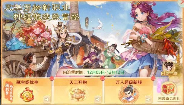 【维护公告】 为了保证广大少侠的游戏体验,《大话西游》手游版将于2024-12-05上午8:00停机,进行每周例行的维护工作,维护时间为早上8:00-10:00,如果在维护期间无法完成维护相关事宜,开机时间将继续顺延,请各位少侠相互转告,并留意游戏时间,以免造成不必要的损失。对于停机期间给您带来的不便,敬请见谅,网易游戏感谢所有少侠的支持和配合! 天工开物 生产职业 年度资料片——《天工开物-生产职业篇》现已开放! 随着五族渐有飞升者的出现,三界的时局渐渐改变,不单是九处历劫点,四大部洲陆续涌现不少物产变化。掘金者嗅到商机,采掘炼化天材地宝,制得法器丹药,助力自身修行。而这些全新的强化材料,更是在市面上得到了修行者的追捧。 加入一门生产职业,选择采集或制作,与他人互通有无,强化自身并助力战斗! 参与条件:等级大于等于0转75级 采集制作 1)金銮殿内的杜如晦会为少侠引荐八大职业的导师,八大职业分为采集与制作两大类别,少侠可选择加入其中一位门下,修行生产技能; 2)采集职业可前往四大部洲寻觅获取各类生产原材料,通过工坊商店交易资源快速获利; 3)制作职业可使用采集职业获取的各类原材料,加以炼化,制得各类强化道具或是战斗丹药,助力少侠修行! 4)采集与制作均需消耗体力,体力可通过活跃度获取。体力还可炼为回气丹,摆摊交易给有需要的少侠; 交易互通 1)生产系统的原料与产物均可在工坊商店进行交易,各位少侠可在此互通有无,各取所需。交易平台会根据买入和卖出的数量自动进行价格调节,交易更加便利。工坊商店以师贡为交易货币; 2)多样的产物能力:生活系统可生产多种全新道具,为少侠的日常养成或者战斗能力提供全新助力。如帮助少侠强化召唤兽与坐骑,制作日常所需消耗品等。还有强力战斗药品提供更强的战斗回复能力! 3)副本战斗能力强化:每个制作职业都可制作本职业的特殊产物,包括属性卡五行转换、心法副本生效、孩子技能替换与天策符等级提升,并带有种族强法加成,为少侠强化副本战斗能力!由于能力强大,同时只能生效其中一种哦; 天雷九劫 三界四洲,天雷频发,异象陡生,归于九地。 1)限时活动-天材地宝 雷劫之地涌现众多物产,前往雷劫之地收集并提交所需之物,加速全服对雷劫之地的探索进度。 活动时间:12月5日维护后-12月19日5:00; 活动参与条件:0转75级及以上; ①每日10:00至次日5:00,少侠可前往当日雷劫之地收集特定产物(或者消耗体力使用生产技能/炼制回气丹也可额外获得当日特定产物)。 提交产物可获得奖励并加速全服探索进度。 ②当全服探索进度达到100%后,可领取探索完成奖励,并开启对应雷劫场景的雷劫秘闻玩法; 2)限时活动-雷劫秘闻 在大家的辛苦努力下,终于拨开雷劫之地的迷雾,谁知竟意外发现神秘青铜枝桠。 原来每块雷劫之地都隐藏着一个雷劫秘闻...解开之后又会发现什么秘密呢? 活动时间:12月5日维护后-12月23日5:00; 活动参与条件:0转75级及以上; ①雷劫之地的全服探索进度完成后将解锁对应的「雷劫秘闻」关卡 ②破解「雷劫秘闻」可获得奖励! ③破解全部「雷劫秘闻」并解锁相应铭文可得飞升泡泡外观奖励! 天地之弈 年度资料片《天工开物》特卖活动——《天地之弈》开启! 参与条件:0转50级以上 活动时间:2024年12月5日维护后 - 12月12日4:59 活动简介: 1)每日布置一个全新的棋局,包含25个格子(22个特价商品、3个天地劫),少侠可选择心仪的商品购买; 2)少侠可手动刷新,每次刷新会重新随机所有尚未购买的商品; 3)购买天地劫四周的商品时有概率立即解锁该天地劫,风、水、火天地劫全部解锁后可领取雷劫宝箱,可能获得飞升限定头像框·历劫飞升、返场空间主题·大唐龙旗、空间挂饰·大唐龙旗; 4)同一行、列的已购买商品和已解锁的天地劫五子连珠时,即可开启五连宝箱,可获得活动兑换道具,可兑换飞升限定足迹特效·九天雷劫、个性队标·涅槃、空间挂饰·仙魔歧路、技能书保护券及其他珍贵道具; 优化内容 抢先体验阶段结束后,进行了如下优化,请抢先体验服的少侠们悉知: 1)失败乃成功之母,采集或制作失败后,也将部分提升技能熟练度; 2)在被地煞星暴打一顿后,原先位于龙宫的狩猎目标-水牛现已搬家至蓬莱; 3)朱铁匠研发了全新技艺,锻造行业的简易鼎炉现可在低等级时制作了,初始制作成本较高,随配方等级提升,成本将逐渐下降; 4)引导任务更加紧密,大话精灵会在任务结束时出现,为少侠详细介绍生产系统; 5)工坊商店业务水平提升!现在可以在制作时预览到所有产物的市场价格,且可一键购买制作所需的产物; 6)兽饰修复符的修复概率大幅提高; 7)五行变晶,农家一锅鲜,天演神通符,清灵明心丹的效果持续时间大幅延长,增至6小时; 8)为了维护体力价值,降低低活跃工作室小号收益,调整了活跃度获得体力的相关规则: ①每点活跃度能够获得的基础体力下调; ②0-100活跃度区间每点可得100%基础体力,100以上活跃度区间每点可得300%基础体力!高活跃度可获得比之前更多的体力! 9)各处界面进行了表现与细节提示优化; 新职业迎回归 天工开物新职业,狩猎锻造致富路!喜迎新职业上线,我们迎来了小霸王的回归,同时希望一起回归的少侠,获得奇妙的职业体验! 天工开物回流季时间: 2024年12月5日维护后-2024年12月12日5:00 1)天工开物同庆礼活动: 本次回流季期间,回归的少侠将领取