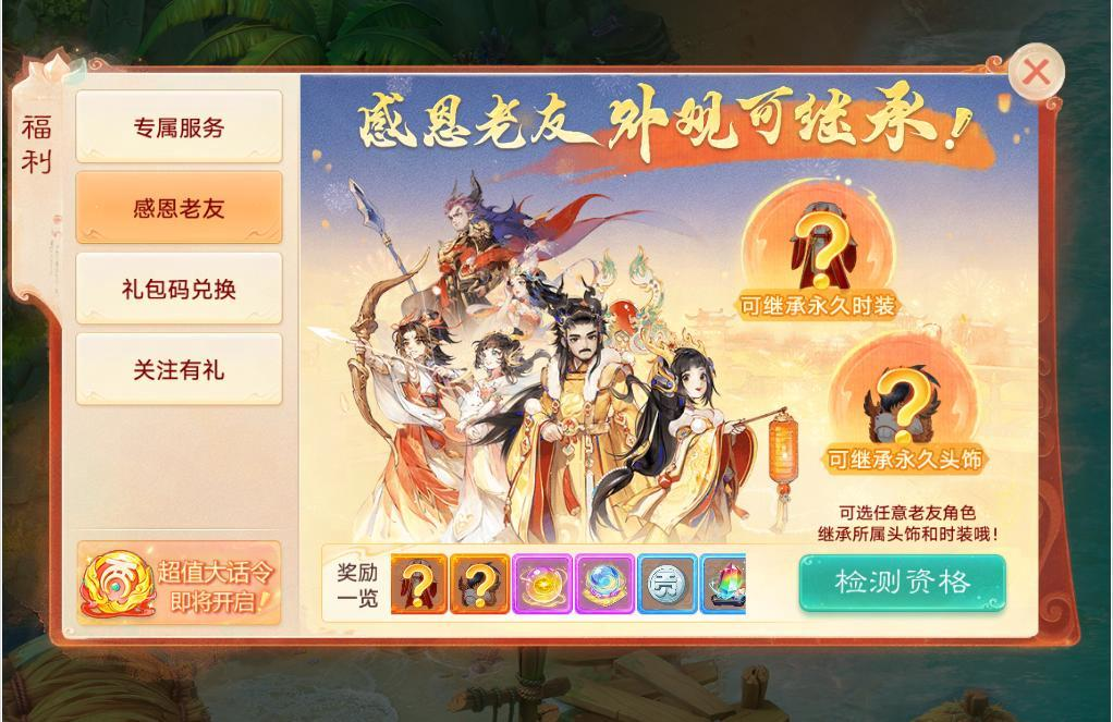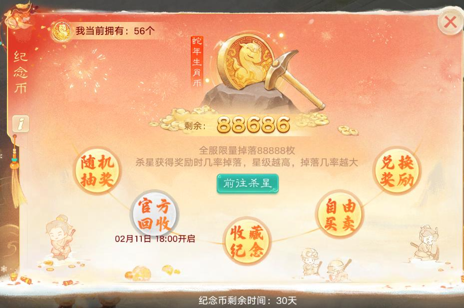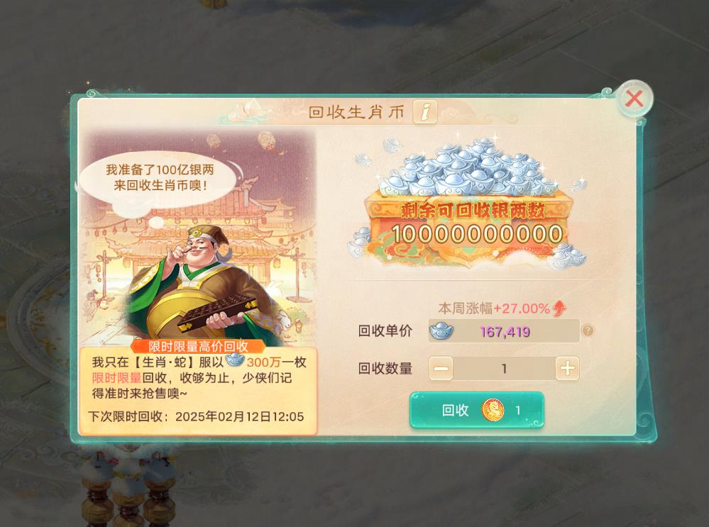 【维护预览】 【年度生肖服】 年度生肖服【生肖·蛇】,2月11日盛大开启,大话邀您一起新春迎蛇年! 开年生肖大服【生肖·蛇】将于2025年2月11日12:00盛大开启! 服务器已开启预约。本次生肖服将开启以下福利活动: 生肖纪念币 生肖纪念币仅在《生肖·蛇》服限量产88888枚,其它服可摆摊购买生肖服的。《生肖·蛇》的少侠击杀地煞星时有几率获得,星级越高,掉落几率越高!生肖币全服可用,用途丰富: 1)兑换:生肖币可以兑换生肖蛇主题限定外观(生肖蛇观赏宠、头像框、气泡框)、时装 、召唤兽、五行材料等养成道具; 2)抽奖:随机抽奖,有几率获得神兽符咒女娲、时装、2级五行材料等奖励; 3)收藏:生肖币可以收藏入【琳琅阁】,生成随机唯一6位编号。如果想要获得指定吉祥编号,也可以消耗更多的数量进行编号自选; 4)买卖:生肖币可以摆摊买卖(购买锁定7天后可重新上架摆摊出售); 5)官方保底回收:官方准备了100亿银两用于生肖币的回收保底,市场上流通的生肖币越少,则单个币的回收价值将会越高! 6)官方限时回收:此活动仅在《生肖·蛇》服开放,每次开启时将会以3000000银两/枚的单价回收少侠们的生肖币; 生肖吉祥宠 1)《生肖·蛇》服开服15天内,所有≥60级的少侠上线即可免费领取生肖蛇吉祥观赏宠(非生肖·蛇服的少侠需通过生肖币商店购买); 2)使用生肖观赏宠道具,可随时召唤出生肖蛇跟随,亦可将其放入家园巡逻观赏,它将为你新的一年带来好运噢~ 3)生肖认证为“蛇”的本命少侠,进入本服还将额外获得永久专属生肖蛇称谓等奖励; 金蛇秘宝 【生肖·蛇】新服为少侠们准备了一大批的精彩豪礼!活动期间,少侠完成活动任务,即可获得跨年福袋,使用福袋开启秘宝即有机会获得华为智能手机(P70)、华为平板(pro11)、足金9999金条(10g)、极米投影仪(H6)、混沌龙兔、绝版混沌时装等惊喜奖励! 狐妖献礼 【生肖·蛇】新服专属活动! 绝版狐小妖幻肤:苏妲己将在本服返场,只需每日登陆,达成活跃度有几率抽取永久幻肤; 感恩老友升级 《生肖·蛇》新服福利升级! 感恩老友活动在本服升级啦!不但奖励大幅提升,还能永久继承同账号下的角色拥有的指定一时装和指定一头饰(典藏以下品阶)! 欢迎新老朋友 红包欢迎新朋友、老朋友!凡入驻本服的新少侠(新设备,新账号)、或者满足条件的回流老朋友(账号历史充值达到指定金额 且 2月1日5:00之后账号未登陆过游戏其它服),都可以在游戏中领取五个现金红包,金额为1元-100元不等(先到先得,送完为止); 首充必返红包 《生肖·蛇》服专属福利!在生肖·蛇服完成任意金额首充,必返2元-100元现金红包!(红包限量,先到先得) 生肖福利直播 大话开年福利派送直播,定档2月11日19:00! 每十分钟一轮,全场将进行13轮福利派送,除了海量游戏内福利道具与生肖蛇纪念币,每轮都有新春限定外观与实物奖励掉落!女娲启灵、一口小火锅、百味佳肴还是四小天王?鸡驴附体,就在今晚! 【全民比斗赛】 第三届比斗争霸赛开启报名,三界召唤兽汇聚一堂,燃情热斗即将上演!单人即可报名参赛,不但能获取海量奖励、现金红包,赢得赛事还有机会独揽高额奖金!最高30余万现金奖金、300亿银两等待大家前来瓜分! 全民比斗争霸 1)【参赛条件】等级≥1转90级,2月13日-2月16日期间单人完成报名即可参赛; 2)【比赛分组】按照参赛选手等级共分为闯荡江湖、纵横武林、逍遥三界、三界战神、睥睨天下五个组别,其中逍遥三界、三界战神、睥睨天下等组别更细分为神兽组和大众组,少侠可以选择报名不允许携带神兽的大众组,参与真正的公平竞技! 3)【比赛流程】比赛进程分为海选赛、抢位赛、争霸赛三个阶段: ①【海选赛】面向所有报名选手,于2月17日-19日举行,每日下午15:00-19:00开放每5分钟匹配一场的匹配,当选手在三天内累计失败5场或者对决30场后,确定海选成绩。获胜场次越多,胜场达成时间越早则排名越靠前,并据此排名决出各组别领先选手进入抢位赛; ②【抢位赛】将抢位赛出线选手分为10个小组,于2月21日-23日每日晚上20:00前进场,每5分钟进行1次匹配,每天共需匹配并完成5场对决,如果某一轮匹配未匹配到对手,将需要等待下一轮匹配,连续3轮未匹配到对手则视为获胜1场,在3天共15轮比赛过后,获胜场次越多,胜场达成时间越早则排名越靠前,并据此排名决出每小组前10进入100强; ③【争霸赛】100强选手在向其他少侠寻求投票支持后落入128个对阵席位,获得投票支持更多的选手有更大概率落入轮空席位(共设有76个非轮空席位、22个首轮轮空席位,2个前两轮轮空席位),确定对阵局势后采取一战决胜负的赛制依次进行对决,某一轮轮空的选手将无需参与该轮对决直接晋级下一轮; 4)【全民银两奖池】初始为200亿银两,随着全民报名参赛和日常活跃行为进行膨胀,回流少侠参与日常活跃更有翻倍膨胀效果,最高可膨胀至300亿银两!赛事结束后,全服所有少侠凭赛事银两积分瓜分该奖池; 5)【赛事现金奖池】初始为25万元,随着全民报名参赛和日常活跃行为进行膨胀,回流少侠参与日常活跃更有翻倍膨胀效果,最高可膨胀至30.75万元!根据各组别实力系数和报名人数分别流入各个报名组别,各组别从进入八强后采用投票选择决定分配规则,如果本组别剩余选手都同意瓜分则共同瓜分本组别奖池,否则继续战斗直到最后一人独揽大奖,其他选手只获得保底奖金; 6)【赛事竞猜】少