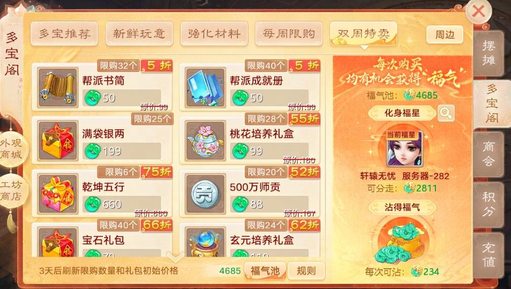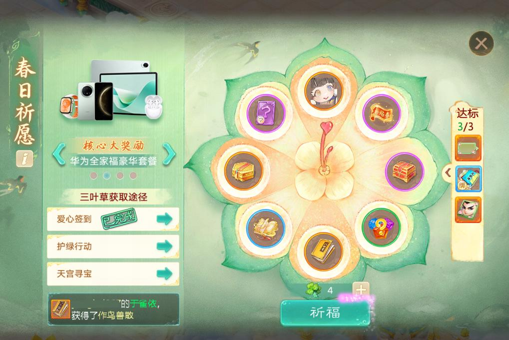 【维护公告】 为了保证广大少侠的游戏体验,《大话西游》手游版将于2025-03-13上午8:00停机,进行每周例行的维护工作,维护时间为早上8:00-10:00,如果在维护期间无法完成维护相关事宜,开机时间将继续顺延,请各位少侠相互转告,并留意游戏时间,以免造成不必要的损失。对于停机期间给您带来的不便,敬请见谅,网易游戏感谢所有少侠的支持和配合! 【春日福利季】 春日福利,换新来袭!3月13日-3月27日,大话手游将迎来春日福利季——召唤兽&时装《以旧换新》、经典玩法《天宫寻宝》回归、《护绿行动》送永久随身特效、《春日祈愿》抽珍稀神兽、华为手机&平板全家福套餐等豪礼,赶快来体验吧! 以旧换新 朝廷颁发惠民补贴政策,全民发放【补贴券】,少侠可以将不用的召唤兽和时装置换成新的类型!亦可将自己的补贴券上架摆摊,赚取大量银两! 1)春日福利季期间,少侠可以将自己身上的旧召唤兽/时装进行换新。召唤兽专场和时装专场每天交替开启,一共14期专场; 2)每个专场品类不同,且名额有限,每天10:05-19:40为预约期,19:40公布中签结果。如果有剩余名额,19:45开启抢注,先抢先得; 3)以旧换新需要消耗【补贴券】抵扣差价,与新旧稀有度、市场价有关(如天龙女换鹿蜀需75张),每张补贴券摆摊价范围为40万-120万。补贴券会优先摆摊购买其它少侠上架的,也可120万银两购买多宝阁的。参与《春日福利季》相关活动后参与祈愿可掉落补贴券,人人可得! 4)召唤兽专场:少侠们可以使用旧的特殊召唤兽(要求亲密≥100万)更换为新。新的召唤兽除了天资与外观相关的会被重置外, 其余养成状态都将完全继承旧召唤兽的(如亲密、龙骨、技能等); 5)时装专场:少侠们可以使用穿过的旧时装更换其它新的时装,放入的旧时装品阶必须≥换新目标时装品阶; 6)温馨提示:1、亲密度和补贴券无需提前准备,可抢到名额后再准备;2、活动14期将累计提供约30种特殊召唤兽(如小范式、鹿蜀、岁辰等)、约40种时装(如朱雀、锦年、夏日晴空等)的换新; 7)全服优化调整:1、根据策划阿福和社区少侠们的呼吁,将在第一期(3月13日)新增少量龙兔的换新名额;2、时装以旧换新补贴券消耗量将大幅减少,抢先体验时已成交的订单我们将根据差价在维护后退还多付的银两; 春日祈愿 1)参与以下活动:爱心签到、护绿行动、天宫寻宝(仅1周),即可免费获得三叶草,进行春日祈愿,抽取豪华福利季奖励哦! 2)豪华福利奖励预览:珍稀召唤兽(珍珑)、终极技能书、华为手机、华为平板、海量大话周边等; 3)全新推出【补贴券】——每次进行祈愿都有几率获得以旧换新补贴券,除用于以旧换新外,亦能摆摊换取银两,每张补贴券可摆摊40-120万; 4)累积抽奖次数,还能免费领取春日花瓣头像框、气泡框、见闻录哦! 护绿行动 大话少侠通过护绿行动找回被怪物夺走的树苗,将其重新种植,为三界上色!护绿证书会记录下少侠的护绿功绩,并奉上春日专属特效“春暖花开”! 1)2025年3月13日8:15至2025年3月27日5:00期间,开放护绿行动。 2)活动期间,少侠参与护绿行动击败怪物可以找回被夺走的树苗;少侠个人种下的树越多,护绿证书等级越高,将会解锁更多的个人奖励和更高等级的“春暖花开”特效~; 3)全服累计种下一定量的树,还会额外解锁护绿目标奖励。 天宫寻宝 经典玩法天宫寻宝再度来袭!每天14:00-14:30、21:30-22:00限时开启,每周最多可拾取16个基础宝箱+8个协助宝箱,经典再现,奖励多多! 1)2025年3月13日8:15至2025年3月20日5:00期间,开放天宫寻宝活动,活动持续仅1周。 2)首次参与寻宝副本可以得到大量宝箱和经验奖励,还可获得3片三叶草,可用于春日祈愿抽奖; 3)每人每周最多拾取16个基础宝箱、8个协助宝箱。拾取宝箱时,优先补齐自己未拾满的基础宝箱,超过后可继续协助他人获得协助宝箱; 4)可在宝象国天赎星君处领取副本制胜法宝,更快结束战斗; 暖春回流季 暖春三月,小霸王游玩至长安,跟我们亲爱的新老朋友们,共同踏青赏春。 活动时间:3月13日维护后~3月27日8点 1)暖春豪礼送武器幻肤——糖葫芦: 最后一次登录在2025年2月1日5点前的少侠登录就送武器幻肤——糖葫芦(7天),每天登录、参与活动拿满满活跃度均可获得豪礼积分,达成一定积分可获得武器幻肤——糖葫芦(永久),4月7日5点前都有机会,快来看看吧~ 2)小霸王回流季福利加持: 活动期间,长安小霸王处将开放“小五叶碎片”、“蠃鱼精魄”、“猴小孙残片”、“老友徽章”的限时兑换; 活动期间,每日同回流少侠共同任务将会获得更多专属奖励和“老友徽章”; 活动期间,可以使用“老友奖章”在长安小霸王处免费为猴小孙、小五叶或者蠃鱼学习技能; 3)回流季回流特权: 在本次回流季期间回归的少侠们可享受24小时在线特权,每日领取减负大礼包,必定获得唤星符和各类减负道具,还有活跃大礼包。每日达成活跃度要求后,可根据角色状况领取以下特权: “额外银两购买”:可在多宝阁中额外购买一次“一大袋银两”,每7天生效一次; “额外帮派书简购买“:可在多宝阁中额外购买一次“帮派书简”,每2天生效一次; “额外五行修炼次数”:自动获得额外100次五行修炼次数,整个活动期间只能领取一次; “月卡升级礼券”:购买月卡可自动升级为24小时在线豪华版,仅限新购买30天月卡,仅生效一次; “每日行囊先抽后付”:获得1次每日行囊先抽后付的机会 温馨提示:以上特权并非所