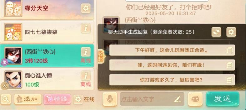 【维护公告】 为了保证广大少侠的游戏体验,《大话西游》手游版将于2025-05-22上午8:00停机,进行每周例行的维护工作,维护时间为早上8:00-10:00,如果在维护期间无法完成维护相关事宜,开机时间将继续顺延,请各位少侠相互转告,并留意游戏时间,以免造成不必要的损失。对于停机期间给您带来的不便,敬请见谅,网易游戏感谢所有少侠的支持和配合! 【多开快捷切换】 游玩多个角色的少侠有福了!我们推出了移动端多角色快速切换功能,让你可以顺畅多开,极速切换!抢先体验期间,最新客户端(引擎版本高于2.1.378)的少侠,登录后有概率收到邮件,获得体验资格; 1)进入游戏设置-多开管理,可以将今日本设备有登录过的角色纳入多开,同组多开最多3个角色,不限服务器; 2)处于同组多开的角色,主界面会出现快捷切换入口,点击对应角色头像即可极速切换登录; 3)多开管理仅限于客户端本地,角色登录其他设备后,需要重新设置; 4)功能仅支持移动端体验,渠道包体暂不支持; 【家园钱柜】 家园储物柜中新增钱柜功能 1)少侠可以前往家园的房间储物柜处存入/取出银两 2)存入银两时,至多可存入80%的银两总持有量,但需保证包裹中至少留有1亿银两现金供日常使用 【全新创角界面】 全新创角界面惊喜登场!现在少侠们可以360度观赏喜爱角色的高清美颜,还有角色们之间的细腻互动动作也千万不要错过哦!我们会不断提升视听品质,不断给大家带来惊喜! 最新客户端(引擎版本高于2.1.383)使用焕新版登录即可体验,部分性能过低的设备为避免卡顿、闪退,暂不开启。 【优化更新内容】 1. 拍照模式下,个性动作可定格在其中一帧来拍照了; 2. 现在空间送花不能增加人气值的提示更清晰了; 3. 超级铃铛优化: 1)点击铃铛发送少侠时,可查看少侠基本信息; 2)现在发送铃铛可以直接选择超级铃铛了(直接消耗仙玉,不需要先买超级铃铛) 3)优化体验,超级铃铛实际存在不足24小时时,根据剩余时间将会有部分返玉; 4. 移民名额更新; 5. 官方小红书社区上线啦!关注小红书,参与话题讨论,不定期派送现金红包、精美周边、礼包码福利~ 6. 新增帮派回流少侠专属权益:回流少侠每日活跃度达到150或参与每场帮战后,都有几率获得【回流赏功礼盒】,开启后为所在帮派赏功堂放入随机奖励,助你成为帮派追捧的回流少侠~ 7. 520游戏热爱日:贪吃的蛇玩法优化: 1)重构了蛇蛇的模型逻辑,大幅度优化了延迟、卡顿等性能问题; 2)基于性能优化,蛇蛇身体的增长规则从吃3个苹果增长1长度改为吃1个苹果增长1长度,蛇蛇的身体长度上限从150调整至300; 3)基于身体增长规则修改,达标难度下降了60%; 5)增加了马赛克道具数量,延长了变身的持续时间; 8. 为响应少侠呼声,520游戏热爱日优化如下: 1)无限热爱新增30次永久刷新次数,助力少侠购买心仪礼包; 2)欢乐对对碰储物箱新增功能:少侠可放回已取出的外观道具(需要未使用)或恢复分解的外观道具(需扣除分解所得的欢乐积分)。 9. 工坊商店优化 1)针对部分有等级使用要求的生活产物,新增了校验购买等级的保护机制,防止少侠购买到无法使用的产物道具 2)优化了受熟练度影响的相关购买限制提示 10. 优化了养育一键培养功能,可以快捷切换需要进行培养的孩子; 11. 大话x白蛇《西湖往事》第八折戏《端阳》更新! 80级及以上的少侠每日满一定活跃度即可参与,凑齐6张不同碎片即可拼出完整戏票,次周周三上午10点好戏上演,前100位最早入座的观众将几率获得龙之骨、1级神兵等奖励! 12. 群聊频道信息增加“一键跟发”功能,看到认同的消息,点击其后的“+1”即可复制并发送此条消息; 13. 手机小组件: 1)小组件有礼:即日起,安装并使用小组件登录游戏累计达1天、3天、7天、14天,即可获得有效期为3天、7天、10天、20天的“策划的锅”头饰奖励!(有效期可叠加); 2)优化部分品牌机型的小组件安装引导教程; 14. 冥土风物志-奇闻异录隐藏线变更为可解锁状态; 15. 天降奇缘全服上线: 限时情缘任务“天降奇缘”全服上线!少侠在完成日常任务时,将会有几率匹配到1位有缘少侠,触发奇缘任务,双人组队完成任务即可获得奖励! 以下内容在2025、卧虎藏龙、情系今生、相聚长安、风生水起服务器放出: 【天涯相随】 在六一儿童节即将来临之际,天涯相随活动开启抢先体验: 抢先体验时间:5月22日8:15~5月24日5:00; 参与条件:0转80级以上 参与人数:需3人及以上组队; 活动说明: 1)任务接取:在天涯相随任务人处领取任务,需要3人及以上组队接取任务,每天5:00重置任务(任务期间少侠无法传送,队长可以放弃任务); 2)任务流程:少侠接取任务后会出现一个孩子,孩子将一路走到天宫或北俱冰原,少侠需要跟随在孩子身边,否则孩子会害怕的停下脚步。在护送期间,孩子会遭遇一些困难,需要少侠帮助他/她克服困难才可以继续前进。护送期间少侠们会变身为随机召唤兽; 3)奖励说明:护送全程分为8段路程,每护送孩子到达一位接引使者时,此段护送结束并获得一份奖励,每位少侠每天最多获得8份奖励; 以下内容在九州共饮、初恋、相聚长安、莺歌燕舞、青龙降世、风生水起服务器放出: 【智能社交功能】 智能社交功能开启抢先体验 1)缘分天空 想在大话世界邂逅更多志同道合的朋友吗?本周更新后,抢先体验服的少侠可以通过“社交-缘分天空”按钮,邂逅与少侠有缘的其他少侠,大数据算法将会根据少侠的喜好