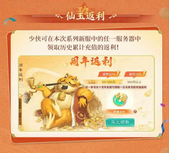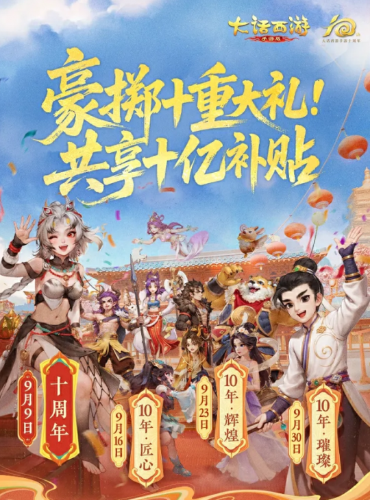 大话西游手游十周年纪念大服,大话手游周年纪念服【十周年】,大话手游十周年大服预约有什么福利?叶子猪带大家来看一看。 本次叶子猪大话西游手游也会有活动,大家可以搜索“叶子猪大话西游手游”来参与活动,超级纪念大服【十周年】,官方豪掷十重大礼,共享十亿补贴。首先是新服专属豪礼码:大话2025,可以领取豪华大礼包! 此外,上线即送永久座驾【拾年】还有十周年纪念外观签到就能领!每天固定刷新十亿银两,人人都能参与瓜分!更有积分换神兽、新朋好友现金红包、十周年秘宝等海量福利活动等你来体验! [编辑:ssc]