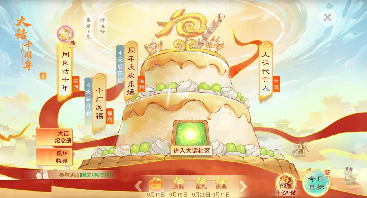 大话西游手游维护更新公告,【大话十周年】共话十年庆典全新篇章全服上线,一起来看看本周大话西游手游都更新了哪些内容? 庆典篇总览 共话十年· 庆典篇 · 大话十周年,正式开启!海量福利上线狂欢,全服豪掷价值十亿福利,大话十周年迎来高潮!9月15日更有神秘惊喜即将揭晓,人人都有! 本周(9月11日维护后~9月18日5点)将迎来以下活动: 十亿补贴福利 十年相伴,全服豪掷价值十亿福利,只为宠你!座驾、时装、红包、贵重道具奖不停!9月15日更有神秘惊喜即将揭晓! 千灯送福 一年一度的纪念实体黄金周边——黄金十年来了,这次登场的将是十周年专属座驾“拾年”!参与千灯送福,在长安城内放飞福灯,即有机会获得黄金周边“拾年”、917元现金红包、绝版时装等好礼! 福利加码:917现金红包数量翻倍,还有机会获得十周年月饼礼盒~ 周年欢乐爆 9月15日 5:00-9月18日 5:00,上线“爆”周年庆宝箱!开启宝箱过程中如若出现“爆”,即可开启几率圣手奖池,终极技能书、龙兔召唤兽、917元现金红包信手拈来! 福利加码:917现金红包数量翻倍,还有机会获得十周年月饼礼盒~ 喊话十周年 活动时间:9月17日10:00~9月18日5:00 参与等级:等级≥80级 共庆十周年,喊话送iPhone17! 大话手游十周年生日暨2025年9月17日当天,上线喊话“大话手游十周年生日快乐#25917”,即可赢取海量游戏周边!iPhone17、十周年定制麻将礼盒、十周年定制纪念币、十周年定制扑克牌、海量10元现金红包等十周年专属奖励大放送! 更有生日动态表情包“ #25917(初心十年)”上线免费用!大话十周年,归来仍少年! 同乘话十年 十年同乘,巡礼长安!“共话十年辇”已从皇宫启程,满载兄弟与回忆,收获十周年贺礼! 活动时间:9月11日维护后~10月9日5:00 参与等级:等级≥80级 活动说明:活动期间,神炼哮天将携“共话十年辇”巡礼长安,每日参与一次完整巡游即可获得奖励,每日22:00~次日5:00可参与夜巡获得召唤兽经验; 盘点十年数据 活动时间:9月11日维护后~10月9日5:00 参与等级:等级≥80级 感谢十年同行!我们为你精心制作了《十周年纪念册》,珍藏你的故事、足迹、荣光,以及与你并肩的伙伴。一起重温专属回忆吧! 大话代言人 共话十年,相知相伴,你会支持哪位代言人呢?分享代言人为他们提升热度,参与大奖争夺吧! 1)参与代言人比拼,争夺每日超奖!终极技能书、三级五行材料、五常神兽、珍稀神兽每日开奖! 2)每位代言人名下累积热度贡献进行排名,前100名少侠活动结束时根据排名将获得大话特权(终身)、大话特权(365天)、大话特权(90天)、大话特权(30天)等惊喜好礼! 大话吉尼斯 1)发布空间作品,参与申报全服大话吉尼斯纪录,秀出属于你的独一无二,活动期间9月11日 10:00-10月9日 5:00,每周四维护后开启新纪录主题:最有趣的召唤兽、天命佩饰、最强力的装备、三界奇闻; 2)点赞、投票送礼他人话题,可以为他人助力,根据名次有限时名帖、丰厚奖励; 3)江湖有巨侠,装备榜前100少侠点赞或送礼投票产生的人气值更高; 4)注意申报时间,先期优势很大哦,当然拉票也是不错的选择; 5)同一榜单,以最高的申报纪录结算; 星君下凡 星君下凡与侠士同贺大话十周年,现已降临三界。星君下凡将在全服开放从9月11日维护后一直开启至10月9日5点! 【回流季开放】 共话十年,倾情陪伴,不离不弃,共创辉煌!朋友,在此10岁生日之际,欢迎回家,让我们一起共度10岁生日! 共话十年回流季时间: 2025年9月11日维护后-2025年9月25日5:00 回流季期间,将开放以下内容: 1)情义互助: 回流季期间,少侠和回归少侠可进行1对1互助,每日通过合作累积活跃度,即可领取宝石答谢礼、技能答谢礼等各类礼包 2)回流季特权: 在本次回流季期间回归的少侠们可享受24小时在线特权; 每日领取活跃大礼包,可在以下福利中任选其一: “额外银两购买”:可在多宝阁中额外购买一次“一大袋银两”,每7天生效一次; “额外帮派书简购买“:可在多宝阁中额外购买一次“帮派书简”,每2天生效一次; “额外五行修炼次数”:自动获得额外100次五行修炼次数,整个活动期间只能领取一次; “月卡升级礼券”:购买月卡可自动升级为24小时在线豪华版,仅限新购买30天月卡,仅生效一次; “每日行囊先抽后付”:获得1次每日行囊先抽后付的机会 温馨提示:以上特权并非所有回流少侠能全部拥有,会根据角色当前情况进行针对性发放。 3)小霸王回流季福利加持: 回流季期间,长安小霸王处将开放“小五叶碎片”、“蠃鱼精魄”和“猴小孙残片”的限时兑换; 回流季期间,每日同回流少侠共同任务将会获得更多专属奖励; 回流季期间,可以使用“老友奖章”在长安小霸王处免费为小五叶或者蠃鱼学习技能; 4)回流充返,送额外仙玉:回流少侠在福利季期间充值,额外赠送仙玉! 5)归阙夺珍,送高价值道具:回流少侠可使用归珍秘券参与抽奖,并可额外消耗对奖池进行加倍,抽取筋骨提气丸、高级凤羽精粹、高级藏宝图等惊喜大奖! 具体内容请登录游戏或藏宝阁主页查看; 6)回流季藏宝阁助力:在回流季期间,藏宝阁同步推出“欢庆10周年”活动,少侠活动期间购号,必得改名卡等游戏道具,还有机会获得25年鎏金宝鉴等丰厚福利。 具体内容请登录游戏或藏宝阁主页查看; 【购号百万补贴】 共话十年,回流购号百万补贴! 欢庆十周年,藏宝阁准备了百万仙玉补贴回家的朋友!2025年9月11日14点起,通过活动专区购买角色的少侠,