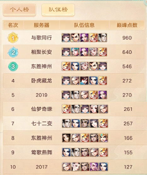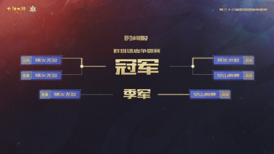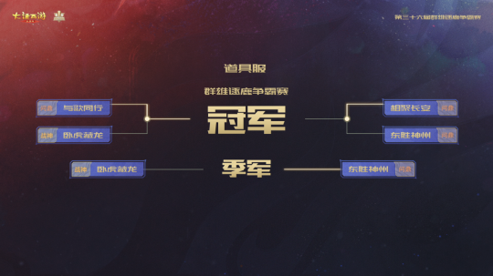 大话西游手游第36届群雄逐鹿争霸赛圆满落幕!恭喜与歌同行问鼎队、情义无双战神队。分别斩获道具服冠军和时间服冠军!与此同时,本次争霸赛结束后,巅峰赛S10参赛名额也将全部确定。 道具服排名公布 冠军:与歌同行(问鼎) 亚军:相聚长安(问鼎) 季军:东胜神州(问鼎) 殿军:卧虎藏龙(战神) 第五名:仙梦奇缘(战神) 第六名:七十二变(战神) 第七名:东胜神州(战神) 第八名:2019(战神) 时间服排名公布 冠军:情义无双(战神) 亚军:风生水起(战神) 季军:空山鸣蝉(战神) 殿军:情义无双(奇袭) 同时,预祝各位获得报名资格队伍榜单,在巅峰赛中斩获佳绩! 最后,再次恭喜本届冠军与歌同行问鼎队、情义无双战神队!同时也恭喜在本次比赛中有亮眼表现的其他各个大神队伍,也期待他们在接下来的各种比赛中赛出水平,取得佳绩。 [编辑:ssc]
