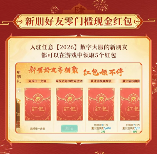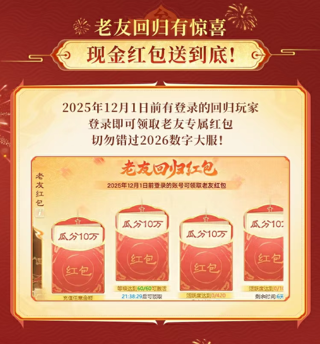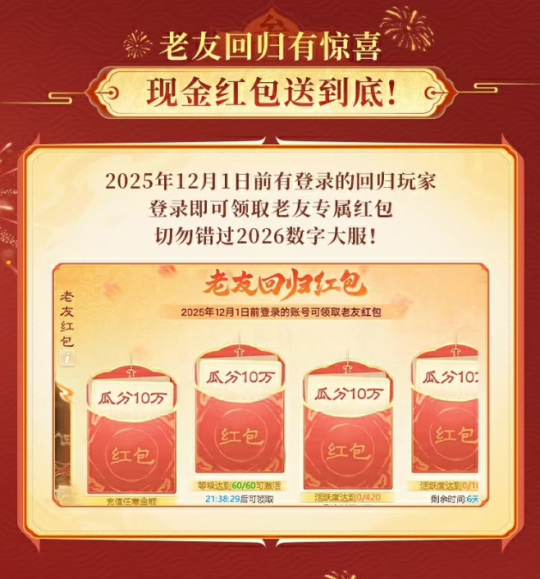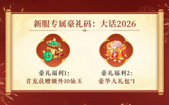 大话手游数字大服【2026】来袭!千万红包+神兽派送,新服福利拿到手软!一年一度,数字大服。十万人气火爆,千万红包派送!大话手游超级年度人气大服【2026】今日开启预约,12月23日重磅开启! 新服福利盘点 数字大服【2026】福利直接拉满,千万红包、珍稀神兽、专属豪礼齐上阵! 新服豪礼码福利:输入“大话2026”,首充额外得10仙玉,还能领豪华大礼包; 签到福利不停:次日登录领绝版座驾,连续登录还能解锁狐小妖、金蟾装备、变色冰雪魔等珍稀奖励; 积分换神兽:开服30日内参与「独占鳌头」活动,积分排名可赢神兽大奖; 红包福利双端享:2025年12月1日前登录的老友回归领专属红包,新玩家入驻即可领5个零门槛现金红包; 年度返利福利:在新服可领取历史累计充值的返利,老玩家充值福利再升级! 更多福利详情,速看下方长图~ [编辑:ssc]