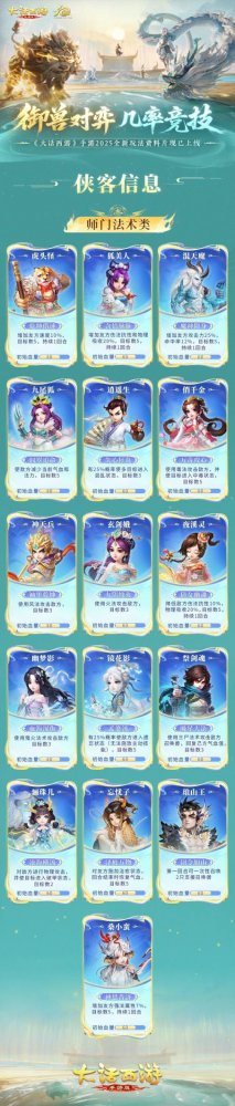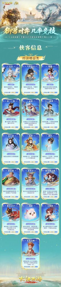 大话手游全新资料片玩法「御兽争锋」昨日已全服上线!铁蛋我也是在游玩过程中悟出一理:“开局选对路,少走冤枉路!”在这个8人同台的策略竞技中,开局侠客选择是定全局胜负的关键之一。今天,就给大家带来侠客属性大合集,跟大家聊聊该怎么选侠客~ 开局选对,赢在起点 侠客核心设定 对局开始时,玩家需从4名随机侠客中选1位。每位侠客都有专属被动技能和初始血量,战斗失败会扣除血量,血量清零即淘汰。 侠客无绝对强弱,核心是适配自身玩法风格与阵容规划:新手可选容错率高的功能型侠客,熟练后则可根据召唤兽羁绊体系,精准匹配联动侠客。选对了侠客才能为后续御兽对弈筑牢根基! 在此,铁蛋为大家收集了新玩法中所有侠客的信息,按照功能类型划分,主要有以下三大类: 【经济增益型:理财大师,养成为王】 这类侠客是局内“经济支柱”,通过技能积累牙币优势,加速召唤兽招募与升阶。 属性亮点:提升利息/免费刷新/解锁召唤兽特权,快速攒齐高品级阵容。 代表侠客:春十三娘提升最大利息至8;聂小倩每回合获得1次免费刷新;郭老板每阶段根据等级获得一只3级或以下召唤兽等; 【战斗增益型:快人一步,解锁上限】 战场等级决定上阵召唤兽数量与高品卡招募概率,这类侠客能帮你抢先凑齐羁绊/突破等级限制。 属性亮点:更早触发多羁绊加成、增加对阵单位数、增强对阵单位属性等; 代表侠客:程咬金、棋师、东海龙王等侠客,对应某项羁绊属性数+1;修道罗最大上阵单位数+1;金角大王,每回合开始时,敌方所有召唤兽血量自动减少10%; 【师门法术型:法术加持,扭转战局】 这类侠客依托师门法术特性赋能召唤兽,通过专属术法效果强化阵容的功能性与爆发力,适配特定流派的战术搭配。 属性亮点:通过侠客自有师门法术,为友方单位提供特有战斗加成或对敌方造成减益效果; 代表侠客:虎头怪,增加5个友方单位的速度10%;混天魔,增加5个友方单位攻击力25%,命中率12%;九尾狐,减少5个敌方单位的气血和法力等。 铁蛋暖心总结:开局侠客选择是「御兽争锋」的第一道策略关,选对适配的侠客,才能让召唤兽养成与羁绊搭配事半功倍。快去游戏中找到你的开局最优解吧! [编辑:ssc]