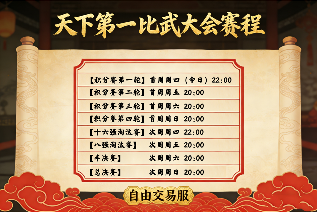 大话手游天下第一比武大会,自2016年首届赛事落幕,万千少侠翘首以盼的天下第一比武大会,2025年重磅回归自由交易服! 经过四台交易服的激烈角逐,目前比武大会参赛资格已定!首轮积分赛将于今晚22点正式开赛,顶尖战队集结,热血对决一触即发!谁能问鼎三界,拿走10万现金大奖?各位敬请期待! 参赛资格:经新星赛淬炼,直通比武大会 天下第一比武大会所有参赛队伍已经产生,共计80个队伍对天下第一的宝座发起冲击,其中开服最早的4个服务器破晓新星赛前16强队伍直接获得参赛资格,剩余的16个参赛名额将由这4个服务器破晓新星赛17到32的队伍中综合实力评分最高的16个队伍获得。 注:参赛资格按最终排名时的队伍成员发放,队员不可更换,请少侠提前确认阵容~ 豪华奖励:现金大奖+限定荣耀 本次赛事福利拉满,不仅有彰显身份的虚拟奖励,更有丰厚现金奖金直达口袋,冠军荣耀与实在福利双丰收!、 现金大奖:冠军队伍独揽10万元,亚军5万元,季军2万元,八强队伍均可得2000元现金奖励; 限定荣耀:解锁专属限定靓号、霸气永久称谓,还有强力仙器等珍稀道具,江湖地位一眼彰显! 赛程安排:两周激战,见证王者诞生 从积分赛到总决赛,两周赛程层层递进,每一场都是实力的较量,每一轮都暗藏逆袭可能,收好这份赛程表,不错过任何精彩对决: 十年磨一剑,今朝试锋芒!无论是历经沙场的老牌劲旅,还是崭露头角的新锐战队,都将在这个舞台上全力以赴。 今日22点,天下第一比武大会首轮战火燃起。愿各位少侠不负韶华,不负十年等待,在赛事舞台上挥洒热血,铸就属于自己的江湖传奇! [编辑:ssc]