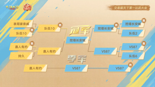大话手游天下第一比武大会圆满落幕,【挖塌长安城】战队登顶10万奖金!时隔十年重磅回归,历经两周热血鏖战,交易服的天下第一比武大会,于昨日正式落下帷幕。 80支顶级战队在积分赛及淘汰赛中层层突围,以精湛战术与默契配合,为三界少侠呈现了一场场巅峰对决,最终八大强队脱颖而出,将荣耀与奖励收入囊中。 荣耀揭晓:四大战队锁定赛事奖项 冠军战队【挖塌长安城】,凭借稳定的战术发挥与关键局的精准决策,该战队一路过关斩将,最终摘得“天下第一”桂冠。独揽10万元现金大奖,同时解锁专属限定靓号、霸气永久称谓及强力仙器,成为本届赛事最大赢家。 亚军战队【队伍10】,作为赛事中的黑马劲旅,战队在多轮对决中展现出极强的韧性,虽与冠军失之交臂,仍斩获5万元现金大奖及对应限定荣耀奖励,实力备受认可; 季军战队【V587】,以灵活的阵容调整和高效的团队协作跻身前三,成功赢得2万元现金大奖,用实力证明了队伍的顶尖水准; 殿军战队【嘉人有约】,从80支战队中突围至四强,虽未能站上领奖台最高处,仍凭借出色表现获得四强专属荣誉,为观众留下了诸多精彩对战瞬间。 此外还有【表哥家亲戚】、【持久】、【队伍2】、【队伍6】(此排序不分先后)战队荣获赛事八强。 赛事回顾:十年之约,热血永不落幕 本届比武大会,是在开服最早的四台交易服的破晓新星赛中选拔出来的80支顶级强队。自2025年12月25日开启首轮积分赛,历经两周赛程层层递进,每一场都是实力的较量,每一轮都暗藏逆袭可能。 无论是冠军战队【挖塌长安城】的强势晋级,还是其余队伍间的焦灼对抗,每一场比赛都彰显着大话江湖的侠义与热血。 随着本届赛事圆满收官,自由交易服的竞技热潮仍在延续。未来,更多精彩赛事将陆续上线,期待各位少侠继续集结伙伴,在赛事舞台上续写属于自己的传奇! [编辑:ssc]