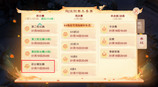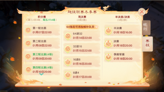 大话手游2025超级联赛冬季赛于今日(1月7日)正式拉开战幕!本届赛事重磅首登自由交易服,免费畅玩服、时间点卡服、自由交易服三大服系独立开赛。热血对决各有千秋,精彩不同凡响! 五大组别激情开战火热冬日名扬三界 2025超级联赛冬季赛将于2026年1月7日至1月18日期间正式开启,赛事分为初入凡尘、闯荡江湖、逍遥三界、三界战神、三界至尊五大组别,期待各组别少侠带来的燃情对决! 赛程全程高能,共设积分赛、淘汰赛、决赛三大阶段。积分赛采用匹配对战赛制,1月7日-8日每日3场激战,1月9日-10日每日4场交锋,累计14场鏖战定高下;淘汰赛、决赛则以3局2胜制决胜负。分级角逐层层晋级,全服少侠蓄势待发,誓要在赛场之上决出王者! 本届冬季赛延续经典加赛机制,积分赛结束后,若排名第64的队伍出现同分竞争者,所有同分队伍将共同晋级积分赛加赛阶段。 加赛将于2025年1月11日(周日)20:00准时开启,将根据实际参赛队伍进行1-3轮匹配对决,最终以加赛新积分排定座次,积分榜首者强势挺进64强! 积分赛阶段,各组别排行榜前20名的队伍,每日首场比赛匹配随机性将会提高,冷门逆袭随时上演。积分赛结束后,积分榜排名前两名的队伍在淘汰赛前两轮将不会直接对阵。 值得一提的是,道具服飞升骁龙组自本届赛事起,将正式解锁对应巅峰点数,荣誉加码,邀你征战! 参与赛事,还有机会获得专属座驾、专属翅膀、专属称谓等重磅好礼!祝各位少侠能够在赛事当中打出属于自己的一片天地! 人气主播担当解说精彩赛事一触即发 本届超级联赛冬季赛特邀小五、可玉、苏语凝三位人气主播组成解说天团!凭借他们对游戏的深度钻研与独到理解,必将为各位少侠带来专业又热血的赛事解说,沉浸式感受赛场激情! 三界分级角逐,决战春夏秋冬!《大话西游》手游2025超级联赛冬季赛今日正式开赛!免费畅玩服、时间点卡服、自由交易服三大服系同步开战,独立角逐!锁定游戏内、CC、抖音、视频号、斗鱼等官方直播间,直击精彩赛事,见证三界荣耀诞生! [编辑:ssc]