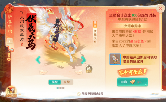 【新春佳节】 衣锦还乡路 活动时间:2026年1月29日5:00-2月12日5:00 活动简介:年货满行囊,衣锦早还乡!年关将至,少侠正式踏上了回家的道路。穿过群山川河,在路途中收集各种年货并将其寄回家中吧! 1)每日登录,满足活跃度和获取来自其他少侠的助力均可获得移动次数; 2)消耗移动次数摇动骰子获取随机步数,到达不同的格子可获取各种年货;不同的年货拥有不同的大小与价值; 3)将年货放入包裹中合理规划空间,并在每张地图的终点处的驿站将全部年货寄出后进入下一张地图; 4)寄出的年货总价值越高,奖励越丰厚,可能获得赤焰妖、终极技能书残卷、1级神兵、聚魄丹、桃花珍露等丰厚奖励;寄回家的累计价值满足一定要求还有机会获得500-2000元不等的现金返乡津贴; 新春预热奇遇 丙午新春,龙马贺岁!2026年春节限定奇遇剧情《世有伯乐》正式上线! 1)活动共设4个篇章,随时间逐一开启。全新春节召唤兽、春节主题外观、海量节庆福利……将在少侠面前徐徐铺展,带您抢先获悉新春第一手情报! 2)每完成一个新篇章,即有几率赢取高级金柳露、浣彩露、桃花珍露等道具奖励; 3)完成全部篇章,必得“马到福到”限时队标,并同步解锁《山海唤兽志》对应召唤兽篇章的完成奖励! 召唤兽前瞻 全新特殊召唤兽:照夜 【属性定位】敏法 【战斗特色】秒三敏法,跨越敏序,风法协战,行动后隐身 【天生技能】飒沓长风 对2个目标造成风法伤害,伤害效果与召唤兽等级、亲密与法力上限有关。 每个新回合开始后,我方人物或伙伴首次施放气血伤害或控制类法术时,照夜有58%概率对一个目标进行单体风法追击(优先选择法术主目标,不可被反震。追击伤害为正常伤害的较高比例) (飞升200级,2000万亲密度效果) 【技能解析】照夜每个新回合开始后,会严阵以待。当己方阵营中的任意人物或伙伴施放气血伤害(包括仙法,鬼火,毒,三尸,龙法,撼山与啸月)或者控制法术(包括混乱,封印,昏睡与遗忘)时,照夜都会对主目标使用单体风法协战,跨越敏序造成一次伤害!轮到照夜自己行动时,可风法秒2,一回合会出手两次!但是少侠要留意,多个照夜同时在场,只有一个会协战~ 【觉醒技能】神行自如 照夜追击或施法时,若命中目标与本回合上次出手时的命中目标相同,则临时提升自身强风20%与风法狂暴率14%;若命中目标与本回合上次出手时的命中目标不同,则自身有25%概率进入隐身状态。 (无价套满觉醒度效果) 【技能解析】 照夜可协战与自身出手,一回合中会行动两次。若本回合第二次出手时,选择与上次命中的同一目标,则会抖擞精神,临时提升自己的强法与狂暴率,力求斩杀!若第二次出手时,选择与上次命中的不同目标,则会休养生息,进入隐身状态,等待下回合机会! 【属性初值】 气血初值:4-20 法力初值:190-570 攻击初值:0 速度初值:115-460 充值有礼 活动时间:2026年1月29日维护后-3月5日5:00 活动简介: 1)活动期间,累计祈福值达标可获得祈愿次数,完成祈愿即可获得马年新春家具八骏图、限定表情包、头像框马踏千金、首发闪卡洗炼的典藏背景卡伏羲龙马出河图! 2)活动期间,登录、累计获得活跃度满足条件即可获得祈福花笺,使用后获得一定量祈福值; 3)活动期间充值仙玉可获1:1获得祈福值。 新春申购 申购期:1月29日维护后~2月5日9:59 领取期:2月5日10:00~2月9日5:00 活动简介: 新春申购,鸿运当头! 全新的马年新春座驾·伏羲天马、座驾·马上来财、时装·奇骏山河开启限时申购! 1)申购期存入一定数额仙玉即可参与抽奖,全服随机抽取100位幸运的中选少侠。中选少侠可在领取期随机获得上述一款全新外观。 2)所有未中选的少侠也无需担心,暂存的仙玉可以全额返还! 闪卡洗炼 2026春节限定背景卡将推出闪卡洗炼功能,可通过洗炼获得不同颜色和图案的闪卡效果~ 【新版活动日程】 本周维护后,我们将为少数侠士优先开放全新活动日程界面,欢迎体验反馈~ 【长安精英赛】 2026年首届长安精英赛,将于2月2日决战长安结束后根据全服长安队伍榜排行情况发放参赛资格。 1)参赛资格:决战长安全服队伍榜各组别前200名队伍(太皓战神组为前300名); 2)参赛奖励:积分赛每获一场胜利获得2个精英赛福袋,战败则获得1个,福袋有几率开出五行材料、终极技能书、高级藏宝图等好礼;进入淘汰赛后,根据排名可获得赛事限定称谓、五行材料、幸运银两袋等奖励; 3)赛程安排:比赛周的周五及周六晚8点分别进行4场积分赛,周日8点举行16强淘汰赛; 4)年度计划:本年度将开启4届精英赛,分别于2月、5月、8月、11月举行; 5)本届主要优化内容: ①大幅优化了积分赛进场卡顿问题; ②优化了替补加队规则,可进行退队加队操作; 【优化更新内容】 1.人气首座雕像外观显示更新,能显示洗炼翅膀、武器幻肤了; 2.武曜之巅首座弟子雕像的外观显示更新,能显示洗炼翅膀、武器幻肤了; 3.每月留影分享上新,2月1日5点后,等级≥80级的少侠参与当月主题拍照分享,可领取一份小奖励; 4.移民 1)名额更新; 2)服务器鎏金十年开启移民功能; 5.御兽争锋更新: 赤狐妖王以下段位的少侠以单人方式随机匹配参与双人天梯赛时,若举报队友挂机并系统判定队友确实有挂机行为后,会补发该对局扣除的段位分,短时间内多次被判定为挂机的少侠将会扣除段位积分; 6.排行榜-对决榜中的决战长安榜、水陆积分榜、独步天下榜、武曜榜和召唤兽比斗等榜单新增本帮排