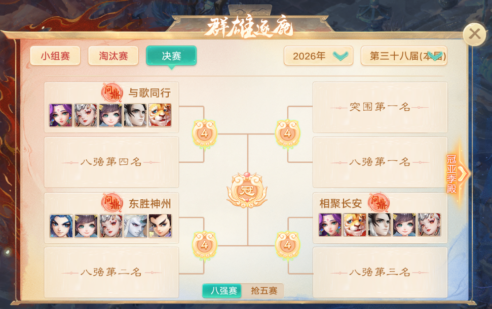大话西游手游第38届群雄逐鹿争霸赛今日正式开赛!本届赛事迎来重磅焕新——免费畅玩服、时间点卡服完成赛制与参赛名额的双重升级,自由交易服更是首次加入群雄逐鹿赛事。 三大区服版本齐发力,全新竞赛规则、更多参赛席位、更丰富的赛事体验。全服群雄集结,逐鹿对决一触即发! 群雄队伍扩容,大佬战队尽数入局 本届赛事最大亮点之一,参赛队伍规模全面扩大!原有赛事服开放更多名额,助力本服强者登顶全服舞台;更随自由交易服首度加入,各路大佬战队集结,激战升级! 免费畅玩服参赛名额翻倍 单服参赛名额从2队提升至4队,有问鼎队伍的服务器更是增至5队。顶尖战力尽数出征! 时间点卡服参赛服务器拓展 由4服扩至6服(风生水起、情义无双、苍山负雪、空山鸣蝉、如鱼得水、霜华胜雪),每服4队,共24支强队参赛! 自由交易服首届群雄逐鹿开启 六大服务器(长安城、洛阳桥、蟠桃园、仙履奇缘、大圣娶亲、二〇二六)参战,每服水陆前4队,24支全新战队强势入局,为赛事注入全新活力! 赛制全面升级,对决更精彩 为匹配更庞大的参赛阵容,打造更公平、更具看点的竞赛舞台,本届赛事针对免费畅玩服、时间点卡服、自由交易服三大版本,量身打造专属赛制升级方案。新增小组赛、优化淘汰赛、定制专属对决等系列规则优化,让每一场比拼都充满悬念。 免费畅玩服:新增小组赛,96强激战燃动赛场 本届免费畅玩服的群雄逐鹿赛事,将在原有晋升组、突围组、晋级赛的基础上,新增小组赛阶段。 96支参赛队伍将被分为8组展开8轮BO1激战。每组前4名晋级晋升组64进32阶段;同时设置专属直通福利,上届冠亚季军可直接晋级晋级赛8强,战神队则直接晋级64进32阶段,层层对决让强者之路更具挑战。 (免费畅玩服八强对阵图,虚位以待) ?时间点卡服:淘汰赛加赛,16进8解锁全新看点 时间点卡服同步开启小组赛+淘汰赛双调整,24支队伍分4组进行4轮BO1小组赛,每组前4晋级淘汰赛;淘汰赛阶段全新新增16进8轮次,竞赛轮次增加,对决过程更具观赏性,让每一支晋级战队都能充分展现竞技实力。 (时间点卡服赛程安排) 自由交易服:淘汰赛阶段BO3单败出局,硬实力定胜负 作为首次参赛的全新赛区,自由交易服采用专属赛制设定。24支参赛队伍,分4组完成4轮BO1小组赛后,每组前4晋级16进8阶段。 (自由交易服赛程安排) 后续淘汰赛全程采用BO3单败淘汰制,更高强度的对决规则,极致考验战队的硬实力与临场应变能力,纯享热血竞技的独特魅力。 参赛规则优化,赛事体验再上新阶! 除了名额与赛制的核心升级,本届群雄逐鹿还针对三大版本的赛事规则进行全方位优化,从赛程时长、报名机制到候补入队、分组判定,多维度调整让赛事流程更合理、竞赛公平性更高,为所有参赛战队打造更优质的赛事体验。 免费畅玩服:赛程拉满两周,多项规则人性化调整 免费畅玩服将比赛时长延长至两周,报名时间固定为比赛周周三至周四,比赛日为每周周五至周日,让战队有更充足的时间备战调整;候补角色可在晋升组别16进8前入队,同时调整部分时段限制,灵活适配战队参赛需求;赛事助威与抽签正式解绑,分组结合队伍综合实力、过往战绩与系统随机综合判定,保障分组公平。 时间点卡服:规则统一标准化,报名比赛同步推进 时间点卡服实现报名、比赛时间与全服统一,同步调整候补入队规则,让战队参赛流程更清晰。分组同样以综合实力、战绩为核心依据,结合随机判定,确保每一组的对决都势均力敌,让竞技比拼更具悬念。 自由交易服:纯享热血对决,专属规则适配新赛区 自由交易服结合首次参赛的特点设定专属规则,赛事期间不开放候补角色,每队最多5人出战,以固定阵容考验战队的磨合度与硬实力。 赛事对阵将以综合队伍实力、过往战绩与部分系统随机分组。确保公平性,让每场对决成为纯粹的实力较量。 金戈铁马,战鼓催征!大话西游手游第三十八届群雄逐鹿争霸赛已全面打响。免费畅玩服名额翻倍、赛制革新;时间点卡服扩服增容、淘汰赛赛制升级;自由交易服首战启幕,硬实力对决。三大版本全服焕新,各路豪杰齐聚三界。 [编辑:ssc]
