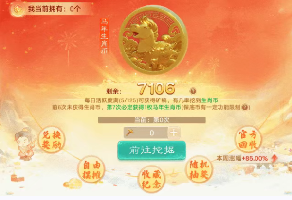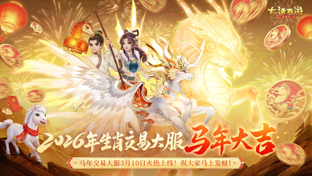 马年交易服 马年生肖交易服【马年大吉】将于2026年3月10日12:00盛大开服,大话邀您一起马上发财! 服务器将于3月6日18:00开启预约,本次生肖交易服将开启以下福利活动: 生肖纪念币 马年生肖纪念币全服限量产9999枚(其中《马年大吉》产1111枚,为主要产出服务器)。全服少侠每日达到125活跃即可获得生肖矿镐,有几率挖到生肖币。生肖币可跨服摆摊各服之间自由流通,价值极高,作用丰富: 1)兑换:生肖币可以兑换生肖马主题限定外观、神兽、马主题座驾、马主题时装、龙马凝神丹、元气丹、幻肤丹、高宝图等20多类稀有物品; 2)摆摊:生肖币开服首日便可跨服摆摊买卖,各服之间自由流通; 3)收藏:生肖币可以收藏入【琳琅阁】,生成随机唯一6位编号+生肖币展柜家具。如果想要获得指定吉祥编号,也可以消耗更多的数量进行编号自选; 4)抽奖:随机抽奖,获得随机道具; 5)官方保底回收:官方准备了100亿银两用于生肖币的回收,市场上流通的生肖币越少,则单个币的回收价值将会越高!可随时卖给官方; 生肖马观赏宠 1)生肖服开服15天内,所有≥60级的少侠上线即可免费领取生肖马吉祥观赏宠(非生肖服的少侠需通过生肖币商店购买); 2)使用生肖观赏宠道具,可随时召唤出生肖马跟随,亦可将其放入家园巡逻观赏,它将为你新的一年带来好运噢~ 马岁生肖礼 生肖认证为“马”的本命少侠,进入本服将额外获得永久专属生肖马称谓等奖励; 女神游园季 春回大地,新蕊花开,《大话西游》手游x 《牡丹亭》联动浪漫开启! 女神活动 春回大地,新蕊花开,“大话东方行”第一站,大话西游手游×浙江小百花越剧院,越剧《牡丹亭》联动浪漫开启! 中华文化传承系列 ·大话东方行 “大话东方行”是大话西游手游发起的国风文化巡礼。出长安,越山河。我们将走遍九州,探寻国风经典,让它们在游戏里焕发新光彩。少侠,行囊已备,邀您共赴这场跨越时空的溯源之旅,见证大话兄弟的中国情义! 浙江小百花越剧院 国内知名的专业女子越剧表演团体,致力于越剧的现代化革新。新生代演员如陈丽君、李云霄,多次登上春晚并参演电影《镖人》,实现了传统戏曲的“破圈”。 值此女神佳节将至之际,大话西游手游携浙江小百花越剧院,以《牡丹亭》为引,共赴一场跨越千年的国风盛会。愿每一位大话少侠,以梦为马,做自己命运的“梦中人”—— 活动时间:3月5日维护后至3月12日凌晨5点; 参与等级:0转80级以上; 1)如花美眷 则为你如花美眷,似水流年~ 活动中,少侠可自选成为花园主或者花匠,通过种花、烧制花瓶、完成花园订单,一起将花园经营成天下第一苑~ 排行榜奖励可获得可交易泳装礼盒、自选武器幻肤、新品头饰、面饰等奖励噢! 2)牡丹亭记 良辰美景奈何天,赏心乐事谁家院? 当杜丽娘穿越到大话世界,会经历怎样的故事?水袖拂长安,越音唱芳华。旧梦新曲,邀您共赏~ 3)大话女神 话题广场发布带有{大话女神}的内容,累计点赞前10名可获得新品周边-大话书包! 游园惊梦 参与活动赢取《牡丹亭》联动全新时装-游园惊梦,兑换超级凝神丹、特殊召唤兽-岁辰等奖励! 活动时间:3月5日维护后 - 3月12日5:00 寻梦宝袋 特惠礼包三选一活动限时开启,累计付费可获得足迹特效-苍松遗墨! 活动时间:3月5日维护后 - 3月12日5:00? 新版活动日程 1)抢先体验服的少侠将会默认切换至新版活动日程界面(支持主动切换至旧版); 2)2026年2月9日后开启的新服会有部分少侠默认使用新版活动界面(不支持切换至旧版) 马年生肖币 马年生肖纪念币全服限量产9999枚,全服少侠均有几率获得。每日达到125活跃即可获得生肖矿镐,有几率挖到生肖币。生肖币可跨服摆摊各服之间自由流通,价值极高,作用丰富: 1)兑换:生肖币可以兑换生肖马主题限定外观、珍稀神兽、马主题座驾、马主题时装、龙马凝神丹、元气丹、幻肤丹、高宝图等20多类稀有物品; 2)摆摊:生肖币开服首日便可跨服摆摊买卖,各服之间自由流通; 3)收藏:生肖币可以收藏入【琳琅阁】,生成随机唯一6位编号+生肖币展柜家具。如果想要获得指定吉祥编号,也可以消耗更多的数量进行编号自选; 4)抽奖:随机抽奖,获得随机道具; 5)官方保底回收:官方准备了100亿银两用于生肖币的回收,市场上流通的生肖币越少,则单个币的回收价值将会越高!可随时卖给官方; 御兽争锋S2 珍珑对各位棋手在万妖国的表现非常满意,第1赛季的激烈角逐即将结束,新的挑战即将开始,谁能够统御万妖从众多侠客中脱颖而出,就能够成为新的万妖之王! 【第2赛季】 1)第1赛季结算:3月12日5:00御兽争锋排行榜将会结算,排行榜前100名的少侠将会获得相应奖励; 2)第2赛季时间:3月12日维护后开启第2赛季,各位少侠的段位分将会重置,本赛季将持续至6月3日; 【侠客升级系统】 侠客系统新增升级机制,当战场等级达到5/8级,且阶段数达到6/12时,所有侠客的侠客技能将会获得两次专属的强化效果; 例如虎头怪的初始技能是增加我方5只召唤兽速度10%,第一次升级后的效果为增加我方6只召唤兽速度13%,第二次升级后的效果为增加我方7只召唤兽速度16%; 地藏王的初始技能是“土”羁绊召唤兽数量+1,第一次升级后的效果为获得随机2个1-3品级的土召唤兽,第二次升级后的效果为获得1个鸡驴大神; 【功能优化】 1)单人休闲模式中新增开设房间,少侠可以邀请相同服务器的其他少侠进入房间,开启单人对局; 2)新增阶段战斗的数据统