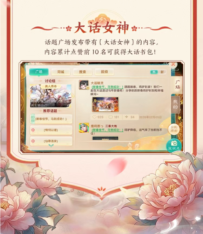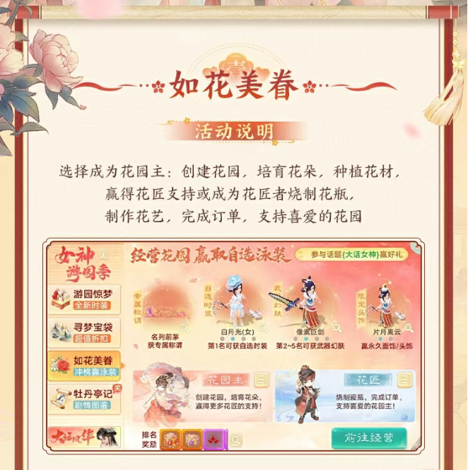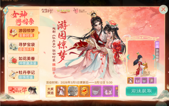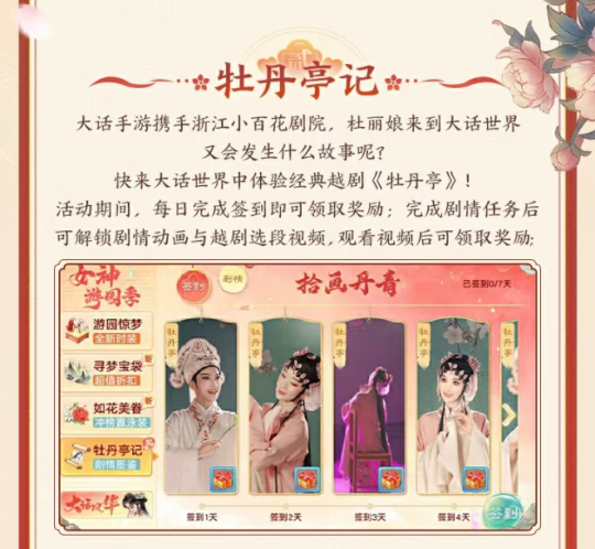 大话手游「大话东方行」国风文化巡礼重磅启程!首站便携手浙江小百花越剧院,将经典越剧《牡丹亭》搬上大话戏台。以越音绕梁,以繁花为媒,邀少侠共赴这场跨越千年的浪漫之约! 大话东方行,溯源国风之美「大话东方行」是《大话西游》手游全新发起的国风文化巡礼,以“数字赋能非遗,国风联结山河”为核心,串联女神节、劳动节、暑期、嘉年华、周年庆、元旦、新年等多个核心节点,联动神州上下的多个顶级文化非遗 IP,打造贯穿全年的文化盛宴,让千年东方文脉在数字江湖中焕发新生。 出长安,越山河。这趟跨越时空的溯源之旅,不仅是对国风文化的传承与创新,更邀每一位大话少侠同行,在山水之间见证经典,在江湖之中感受大话兄弟的中国情义!越剧顶流助阵,《牡丹亭》韵满三界值此女神佳节来临之际,我们有幸邀请国内知名专业越剧表演团体——浙江小百花越剧院,携手解锁《牡丹亭》的经典魅力。水袖轻舞惊鸿影,戏里戏外皆佳人,让传统国风与大话江湖碰撞出别样芳华~ 浙江小百花越剧院,是致力于越剧现代化革新的标杆剧团。旗下新生代演员陈丽君、李云霄更是多次登上春晚舞台,还参演了电影《镖人》,以青春姿态让越剧之美被更多人看见。 联动期间登录游戏,进入活动页面,即可领取签到好礼;完成任务,解锁剧情动画与越剧选段视频,更可获得专属活动奖励。 女神节活动开启,繁花福利享不停即日起至3月12日,少侠登录游戏即可参与「女神游园季」系列活动。化身花园主或花匠,在繁花之中解锁多重福利,还有联动专属时装、限定称谓等丰厚奖励等你来拿! 更多精彩活动内容,请看下方长图~ 春满三界,越韵大话。《大话西游》手游×浙江小百花越剧院,《牡丹亭》联动现已浪漫开启!诚邀共赴这场国风盛宴,以梦为马,做自己命运的“梦中人”。在繁花与越音之中,解锁大话江湖的全新浪漫~ [编辑:ssc]