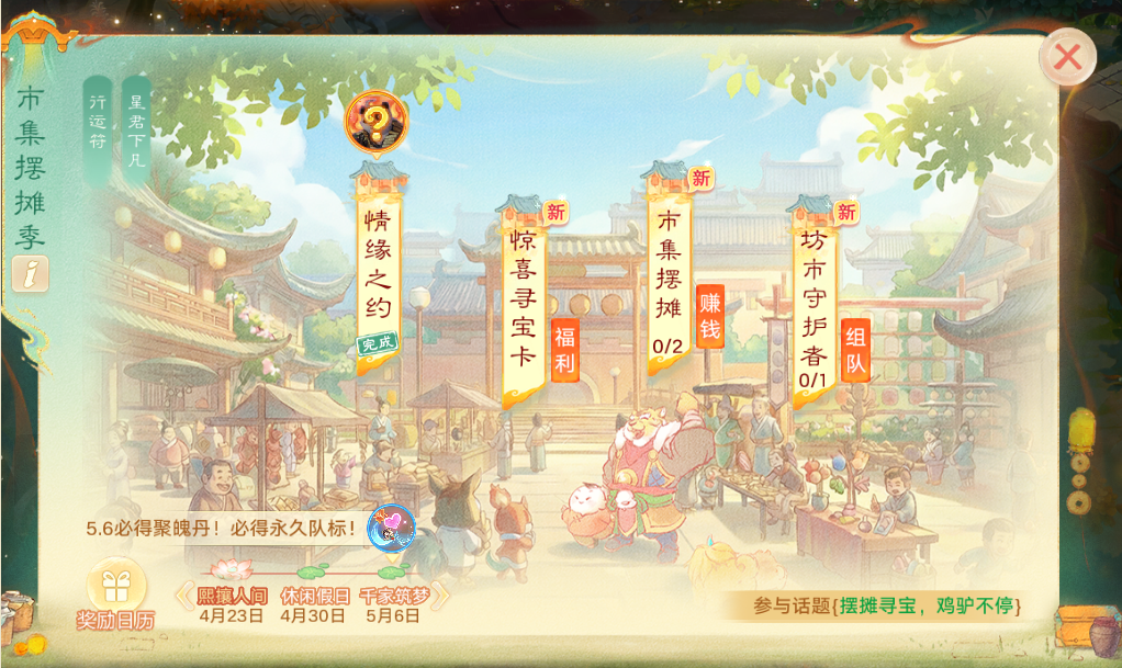 优化更新内容 1. 优化了头像框“驱神征召”的底图显示; 2. 人物抗性界面增加无价雅声生效后的效果预览(仅为雅声无价效果的战斗外预览,实际数值在进入战斗后才会生效) 3. 5月1日劳动节,福星特别任务上线,当天照顾好友家园作物的热心少侠,除草浇水都有额外好心值奖励; 4. 武曜之巅优化: 1)加强八大高手的参赛提醒; 2)加强八大高手的荣耀感知,现在可以分享了; 5. 护送同一支普通商旅途中成功在抢夺战斗胜利3次后,将无法被抢夺,意在改善各位少侠护送商旅后被多次抢夺的负面体验。 6. 《凌烟绘卷》移形石掉落调整:鉴于《凌烟绘卷》在集满隐藏功臣后,继续使用“移形石”已无额外收益。本周更新后,已集满隐藏功臣的少侠将不再获得移形石,同时系统会自动为您回收包裹内多余的该道具; 7. 优化和精简了部分引导(如战斗表情包、聊天助手引导等),避免少侠在游戏体验过程中被过度打扰~ 8. 近期我们收集到有少侠在贴吧反馈焕新版朱雀时装品质有所下降,针对这套时装我们进行了品质提升优化; 9. 护身符系统: 1)洗尘过程信息展示与操作引导优化; 2)智能洗尘流程优化,支持选择由系统自动揭晓普通神秘结果; 3)尘缘点转移功能,现也支持3-5级的属性一或属性二为满尘缘的护身符使用; 4)护身符强化交互流程优化; 5)护身符部分相关功绩文案与展示优化; 10. 战斗内场景战斗信息(如噤若寒蝉、双管齐下等)支持一键提醒队友功能; 11. 修复女人专属佩饰-白骨毒发后中毒效果异常清除的问题; 12. 藏宝阁新福利重磅推出: 1)“购号尊享,权益升级”,4月23日约10时起,藏宝阁购号,送免费外观,改名卡等多重福利,具体权益请登录藏宝阁查看; 2)“卖家专属,购号福利”,4月25日起,角色在藏宝阁出售成功后,将会获得红包权益+道具礼包双重福利。红包可用于游戏充值和新角色购买时的金额抵扣,道具礼包将在购买新角色后,立即发放至新角色。具体规则权益请登录藏宝阁查看; 以下内容在共话江湖、鎏金十年、六六大顺、情系今生、相聚长安、与歌同行、风生水起服务器放出: 帮派商旅 护送商旅全新内容——《帮派商旅》强势来袭! 活动时间:每周二的11点5分, 17点5分,21点5分有概率在方寸山、白骨山、万寿山刷新一队帮派商旅,更有几率刷出奖励更丰厚的皇家帮派商旅 参与条件:等级达到服务器等级-10级的同帮少侠可组队前往方寸山、白骨山、万寿山寻找迷路帮派商旅护送至长安城程小晶处。也可抢夺其他少侠正护送的帮派商旅。成功护送后,护送者可获得保底见闻录的丰厚奖励,护送者所在的帮派还会刷出商旅宝箱供同帮成员捡取。快来共同捍卫帮派荣誉与利益吧! 以下内容在2024、情系今生、相聚长安、与歌同行、风生水起服务器放出: 寻芳十八 传闻车迟国三位大仙正在大雄宝殿内举行诡异的解封仪式,企图唤醒沉睡已久的蛮荒妖王。一旦妖王连续得道施法,必将生灵涂炭。各位少侠需火速前往,打断这场邪恶的仪式! 为了带给各位少侠更加丰富多样的挑战体验,寻芳副本新增第18关!3转140级及以上少侠,通关寻芳第17关后可以进行挑战。 本周小幅下调了怪物的忽视控制、抗控制、抗物理等属性,同时修复了反震伤害异常的问题。 市集摆摊季 唐王下令定期开启市集摆摊季,三界通商,万货云集。这一季的长安,因你到来而愈发璀璨。 活动开启时间:4月23日维护后-5月6日5:00 参与条件:0转80级以上 召唤兽升阶 1)市集摆摊季活动期间,累积多日完成市集摆摊季的每日目标即可免费领取升阶丹!升阶丹可摆摊交易! 少侠可使用“升阶丹”,对部分高级召唤兽使用并升阶为特殊品质,升阶效果如下: ①解锁限定怀旧端游形象幻肤,升阶后可在幻肤系统中消耗少量银两获得; ②召唤兽觉醒技能进阶,战斗效果更强力; ③技能格增加两个; ④升阶后,天资与初值均不变,成长率不重置,天资技能格与变异均维持原样! ⑤升阶后召唤兽可升星,不可化神,不可被其他召唤兽用于升星。 2)升阶条件:召唤兽达到1转/服用了4个龙骨/技能格6开,及服用新道具“升阶丹” 3)升阶消耗:每次可使用1个升阶丹,使用后有概率使召唤兽升阶,第14次必定成功! 4)升阶后召唤兽数值一览: ①龟丞相-特殊品阶 少侠可使用升阶丹,使高级召唤兽龟丞相有概率升阶为特殊版龟丞相; 【觉醒技能】龟甲 原技能效果:增加召唤兽物理吸收20%。 升阶后技能效果:增加召唤兽物理吸收20%。场上任何单位使用药品后,龟丞相将救人心切,有15%概率对己方血量最低的非倒地单位恢复20%气血法力,每回合最多触发一次。 (以上效果均为无价套满觉醒度的效果) ②剑精灵-特殊品阶 少侠可使用升阶丹,使高级召唤兽剑精灵有概率升阶为特殊版剑精灵; 【觉醒技能】迅捷 原技能效果:施放天外飞魔后,自身100%概率也进入相同的加速状态,持续3回合。 升阶后技能效果:施放天外飞魔后,自身100%概率也进入相同的加速状态,持续3回合。被速上的单位或自身,在回合开始后有10%概率自行摆脱冰混睡忘状态。 (以上效果均为无价套满觉醒度的效果) 情缘之约 活动期间,每天上线签到即可领取【升阶丹】等丰厚奖励。累积签到还可以领取【寻宝闪卡】,5月6日10点后使用,即可参与抽取五常神兽; 市集摆摊 活动期间,可以通过活动界面前往指定场景进行固定位置摆摊售卖,也可以成为行脚商人自由移动行商; 1)完成每日目标、提升摊位等级、购买货