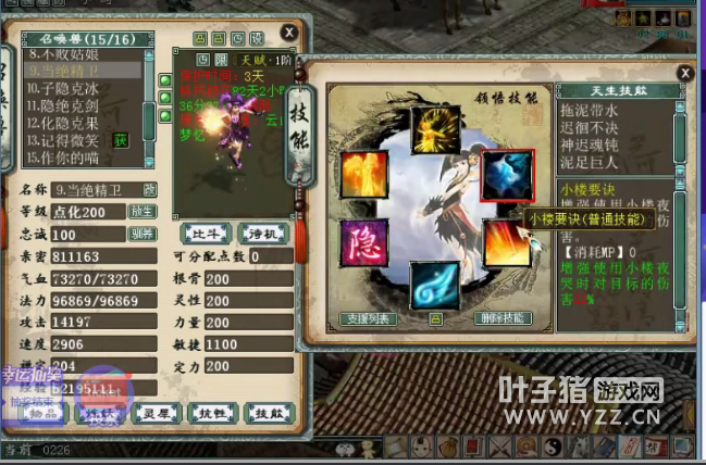 今天给大家带来一位玩家直播给自己的精卫吃万兽要诀的现场情况,要知道现在的游戏里精卫和剑精灵的用处是非常之大,不管是在PK还是在NPC战斗中,这个精卫满级200达到了2900+的敏,可谓真是战斗利器了,唯独缺少一个克火技能,不知道今天这位玩家能否顺利的吃出技能?一起来看看。 |
