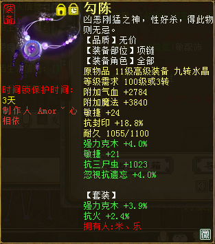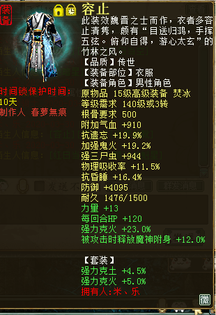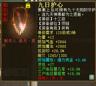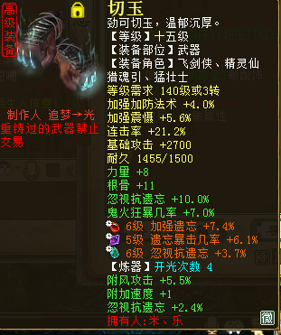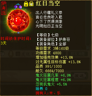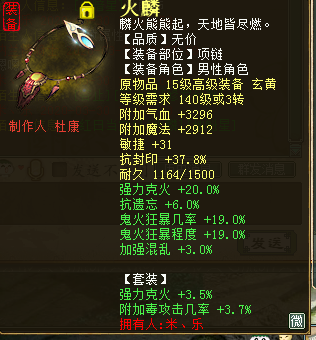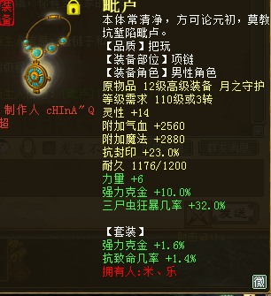 现今每个大话角色绝非只有一种玩法,随着天赋、法门的相继问世,每个种族的可玩性也都趋于丰富。而能把一个角色的所有玩法都开发出来并应用于实践的,绝对是最用心的玩家,比如下面这位。 ![]() 遗忘攻坚套 ![]() ![]() 程度鬼火套 上面三图分别对应三套装备搭配:遗忘攻坚套、三尸回血套、程度鬼火套。其中的遗忘攻坚可以上到2600敏,三尸回血最高回血数值65W+,看到鬼火秒的100+程度,是不是很爽?没有晒装备图的帖都是没有灵魂的,看图,首先是遗忘套展示。 ![]() 蓝字忽视忘0.9炼化加敏魔族衣服 ![]() 蓝字忽视忘0.9炼化加敏抗灵宝魔族帽子 ![]() 蓝字加敏抗人法敏鞋 ![]() 底子加敏炼化忽视忘4加敏项链 ![]() 炼化忽视忘10,炼器忽视忘2.4加敏魔族武器(炼化那根骨力量如果是敏多好) ![]() 黄字抗内丹效果加强忘忽视忘七级护身符(刷刷功绩吧,绿色的好看) ![]() 双忽视忘13星卡 下面是三尸回血套部分展示。 ![]() 三尸几率32项链一条 ![]() 蓝字带克金,几率程度全部单炼化满19 ![]() 黄字加魔法对召唤兽伤害三属性护身 ![]() 三尸程度几率13星卡 ![]() 双三尸数字13星卡 最后是鬼火装备部分展示: ![]() 双叠加炼化克火+套装克火 ![]() 同样双叠加炼化+套装克 ![]() 蓝字克火5.8的鞋子这要是炼化再高点... ![]() 克火20加几率程度单炼化满项链,同样套装克火 ![]() 黄字强克+无属性伤害,三属性护身 ![]() 双程度14星卡 以上是这位男鬼玩家的部分装备展示,没有展示出来的装备,按这位玩家的话说就是,留个悬念,小编是无意中结识这位玩家,一位把自己角色武装到牙齿、浑身都是刺儿的男鬼,在游戏中,这样的角色绝对不好惹,打架回血套,任务鬼火秒,还能上攻坚下刀子,而且敏能上到2600.想想都可怕。 由于此玩家之前的回血数值没有截图,下边只展示一下鬼火伤害图,不展示图的帖子都是耍什么来着,不过回血图可能要欠着了... ![]() 塔4百万伤害(孩子没有叫) ![]() 天宫寻宝伤害 ![]() 周末任务将近200W伤害 最后感谢米、乐的投稿。对于没有展示的部分装备,米、乐表示留作悬念,有心的玩家会根据已经展示的装备进行计算搭配的。只要用心,每位玩家都可以玩出属于自己的精彩。 [编辑:纳兰德骑士]